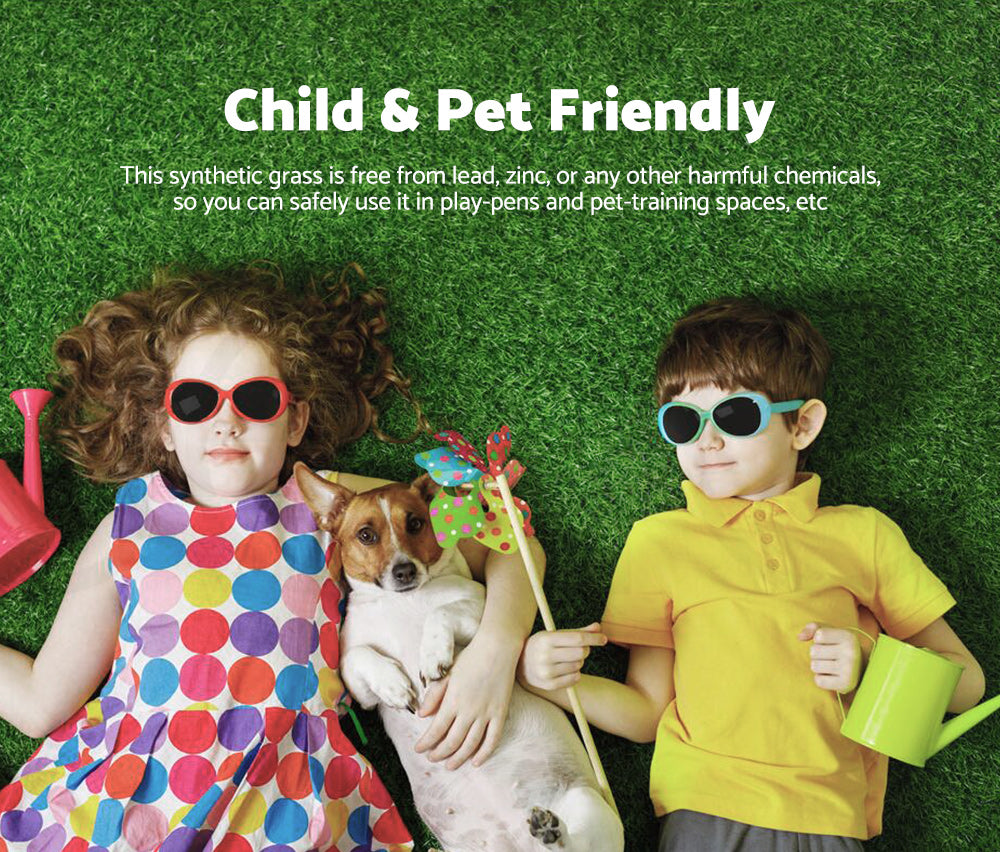 • Child & Pet Friendly: This CE approved synthetic grass is also certified by SGS laboratories on fire/UV resistance to ensure maximum safety during use.