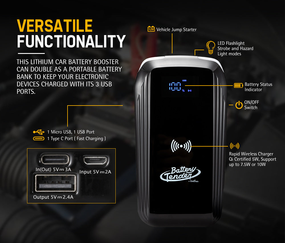 When you're traveling or just trying to get to work, a dead car battery can instantly ruin your day. If you believe jumper cables are the only solution to that problem, think again, the Battery Tender jump starter is designed to get you covered. Providing 1,000 amps of starting power, this option from Battery Tender is capable of jump starting 12V 4x4s, SUVs, trucks, or vans up to 30 times on a full charge. This lithium car battery booster jump starter also serves as a compact and powerful battery bank with 8,000mAh capacity, allowing you to charge your phone or any other devices, and it is also equipped with 10W rapid wireless charging capability! This lithium jump starter features spark-proof technology and polarity protection to keep you safe from improper jumpstarts and charging. It has a digital LCD screen for instant assessment of remaining battery life, and the integrated LED light has normal, strobe, and hazard modes against potential emergency. Be sure not to miss it.