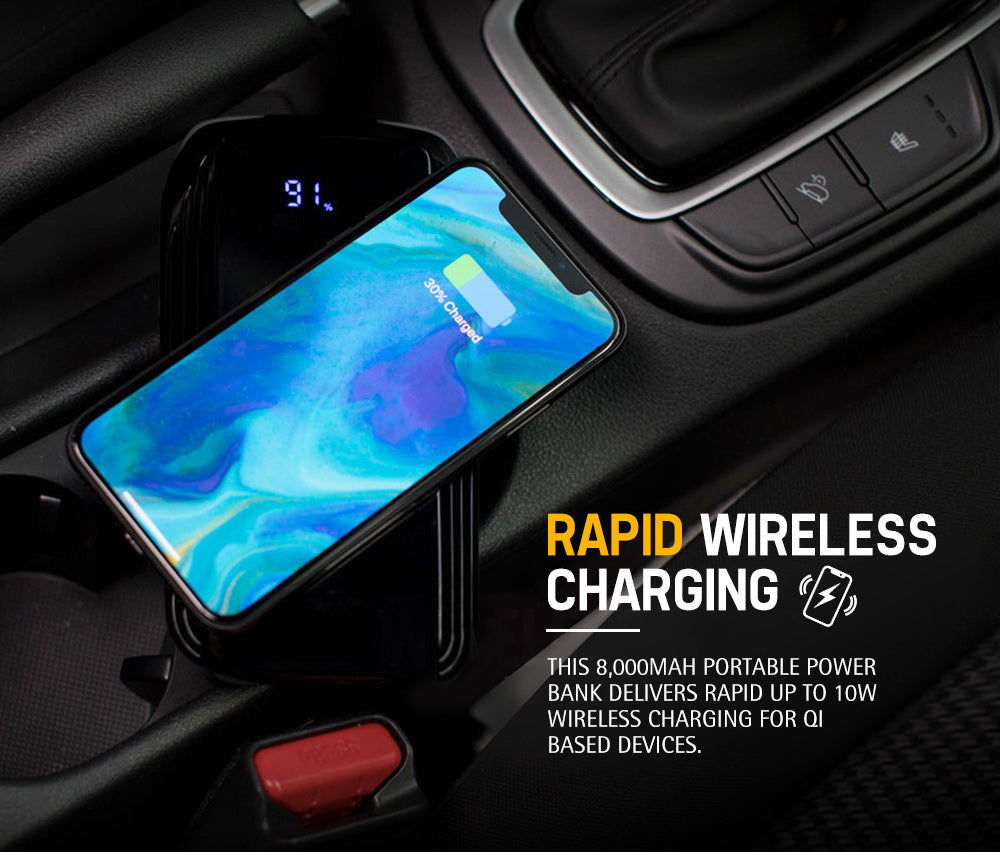 • Rapid Wireless Charging: This 8,000mAh portable power bank delivers rapid 10W wireless charging for Qi based devices.