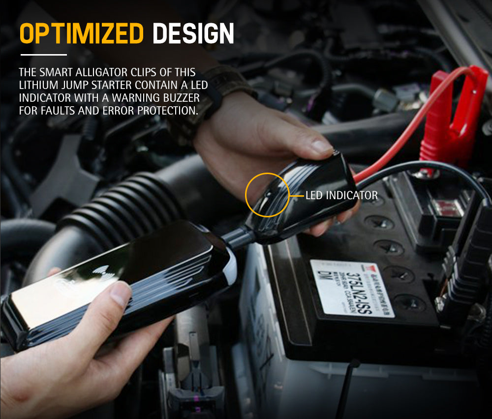 • Optimized Design: The smart alligator clips of this lithium jump starter contain a LED indicator with a warning buzzer for faults and error protection.