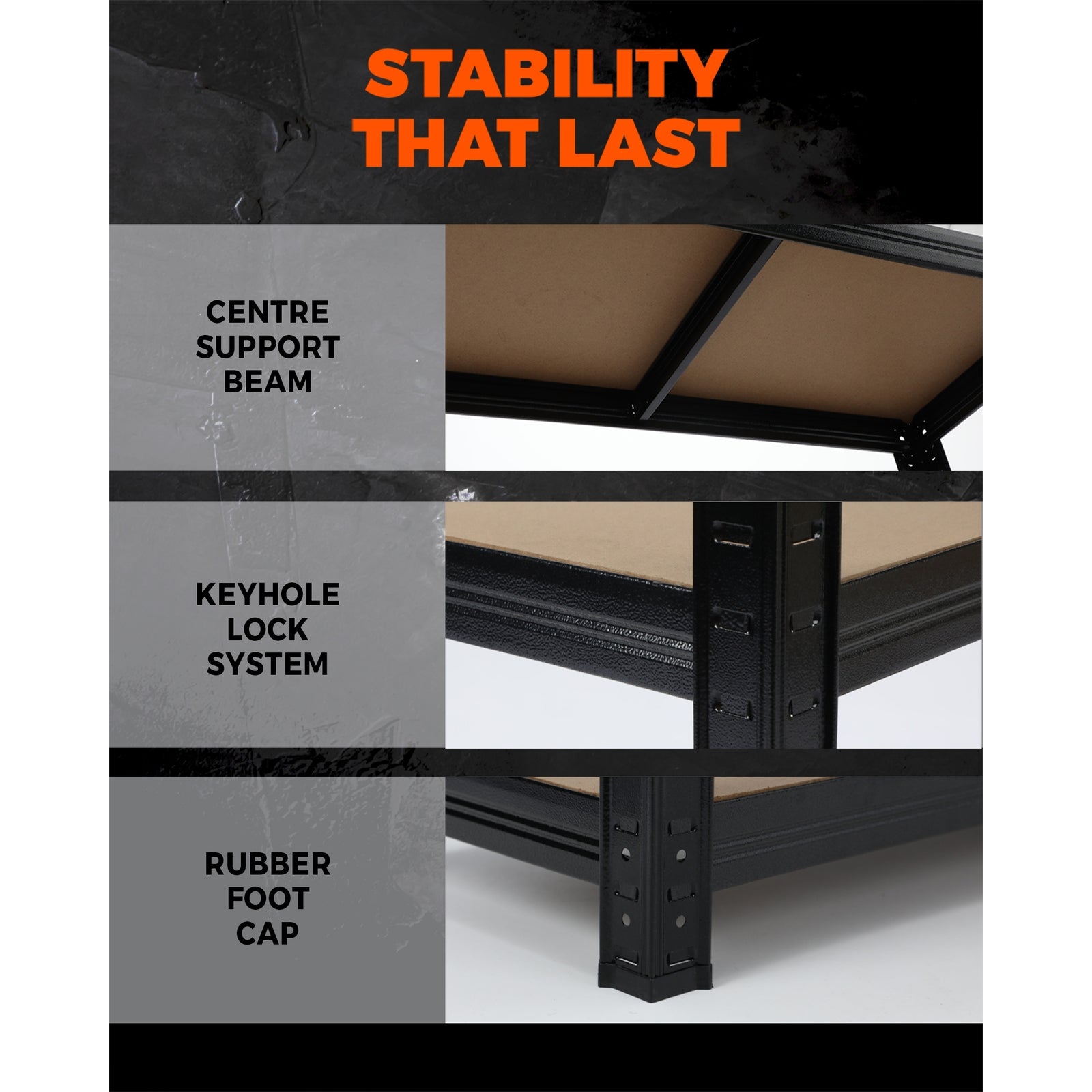 Store them safe and strong with our Sharptoo 5-tier Storage Shelf. With a stronger, corrosion-resistant cold rolled steel construction, the storage shelf structure will not easily buckle under heavy weight and each tier can hold up to 150kg in capacity. The sizeable 5mm thick MDF shelving allows for ample space to store anything with adjustable heights to make things more convenient for you. Plus, a centre support beam provides reinforced strength for every shelf. Best of all, putting together this storage shelf is fast and effortless with its boltless assembly that only requires a small assistance of a hammer or rubber mallet to set the catches in place. Use it in the garage, shed, home or shop, the Sharptoo 5-tier Storage Shelf can also be transformed into a work bench if desired. Need to say more? Set yours up today.