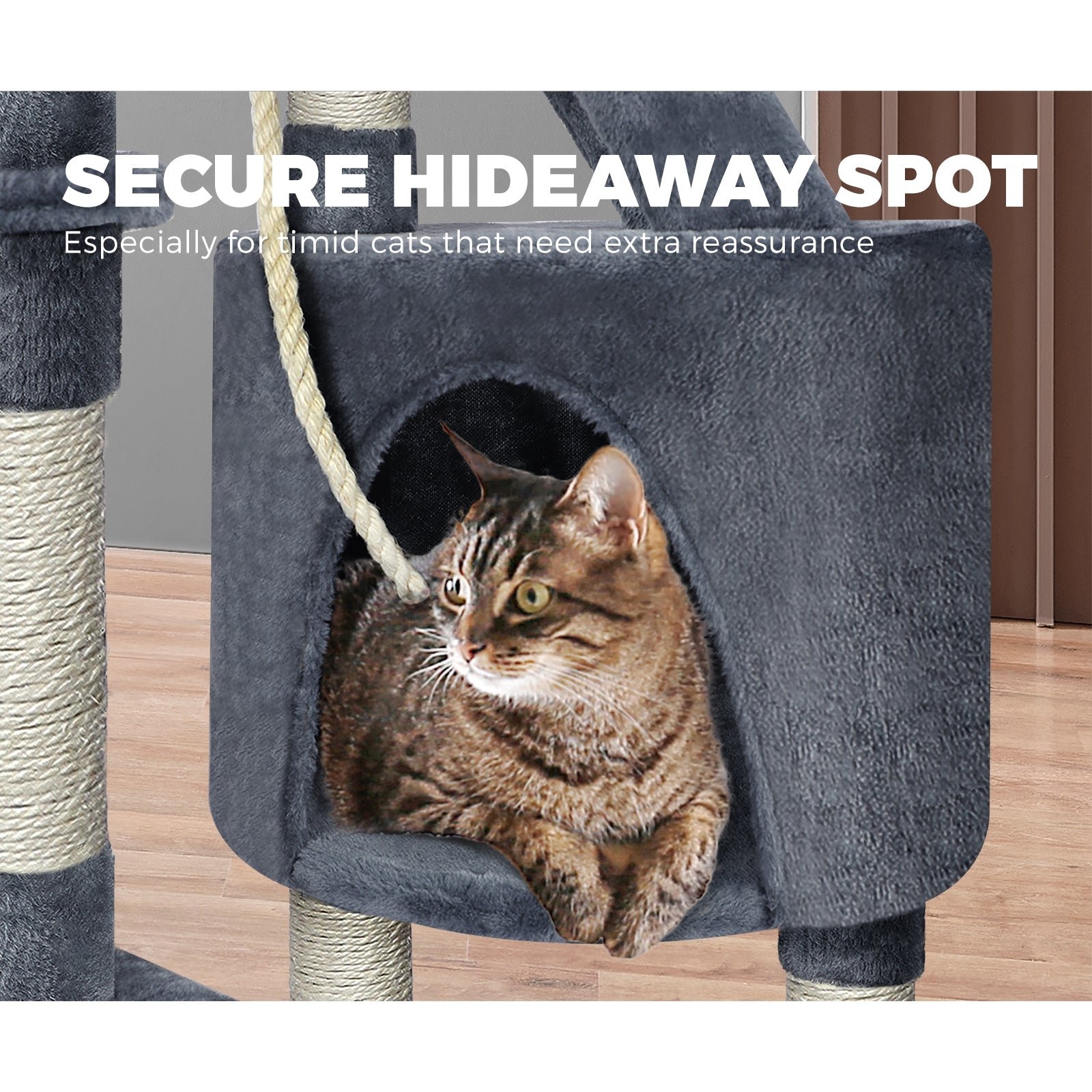 Get your cat a 47”/ 120cm Cat Tree to stimulate their natural instinct in a fun way! It is an all-in-one tower that comes with multi scratching post, hideaway spot, climbable ladder, multiple platforms, and a cute hammock. Needless to say, our cat tree is made with durable E1 board, covering with pet-friendly and plush fabric for a comfortable and sturdy retreat. Besides the ultimate joy of napping on a high spot and in a body-hugging hammock, having a cat tree with sisal ropes promotes healthy claws and relieve stress through natural scratching. It is an excellent source of exercise for your cats to prevent them from clawing your furniture, curtains and carpet while satisfying their scratching instinct and promoting nail health. Our cat tree comes with assembly manual, with step-by-step instructions to assist you in putting this cat tree together in no time. Your cat will be jumping right into it for an adventure and snooze. Shop now to give your cat a lovely surprise!
