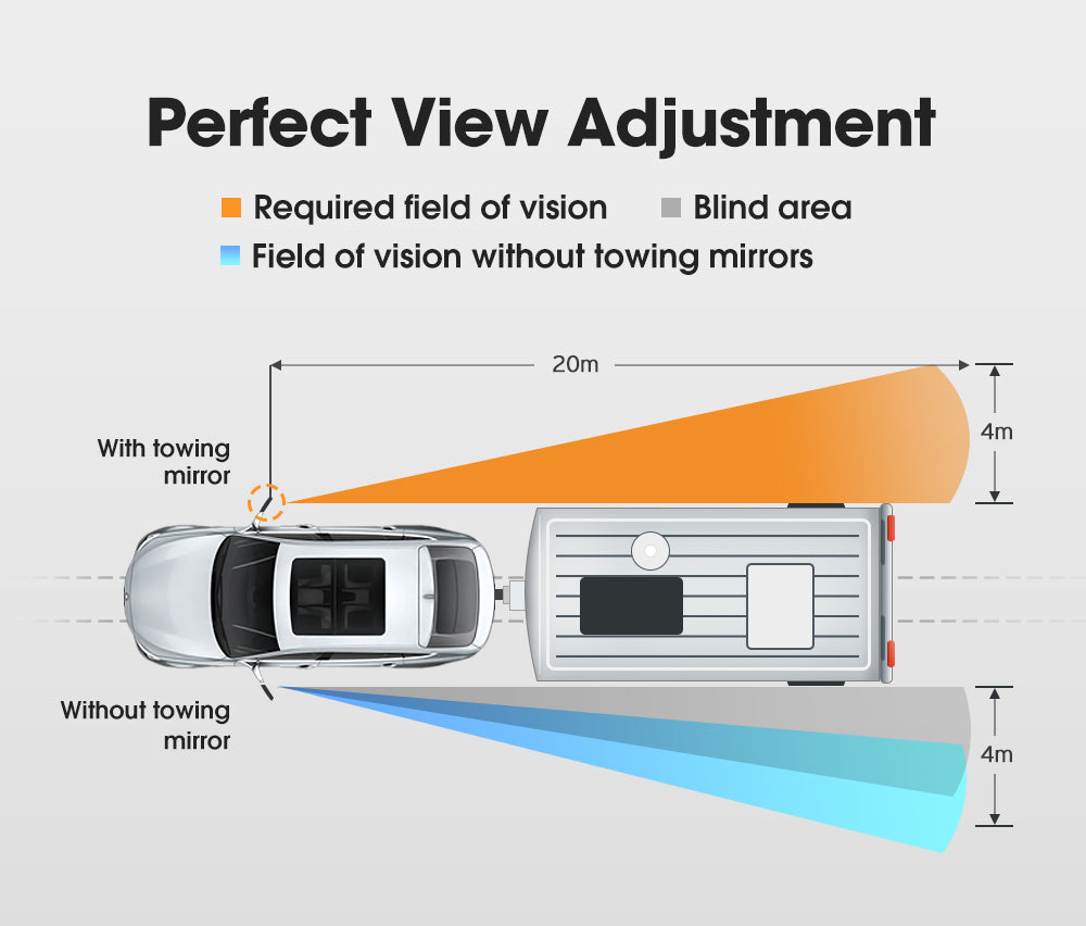 • Blind Spot Elimination: Equipped with a premium convex mirror, our towing mirrors provide you with unparalleled visibility and eliminate those frustrating blind spots.