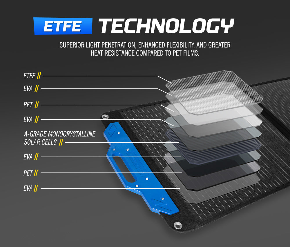 • Subversive ETFE Tech: Our solar panel use ETFE technology, allowing for higher light penetration, excellent flexibility, and more heat resistance than PET films.
