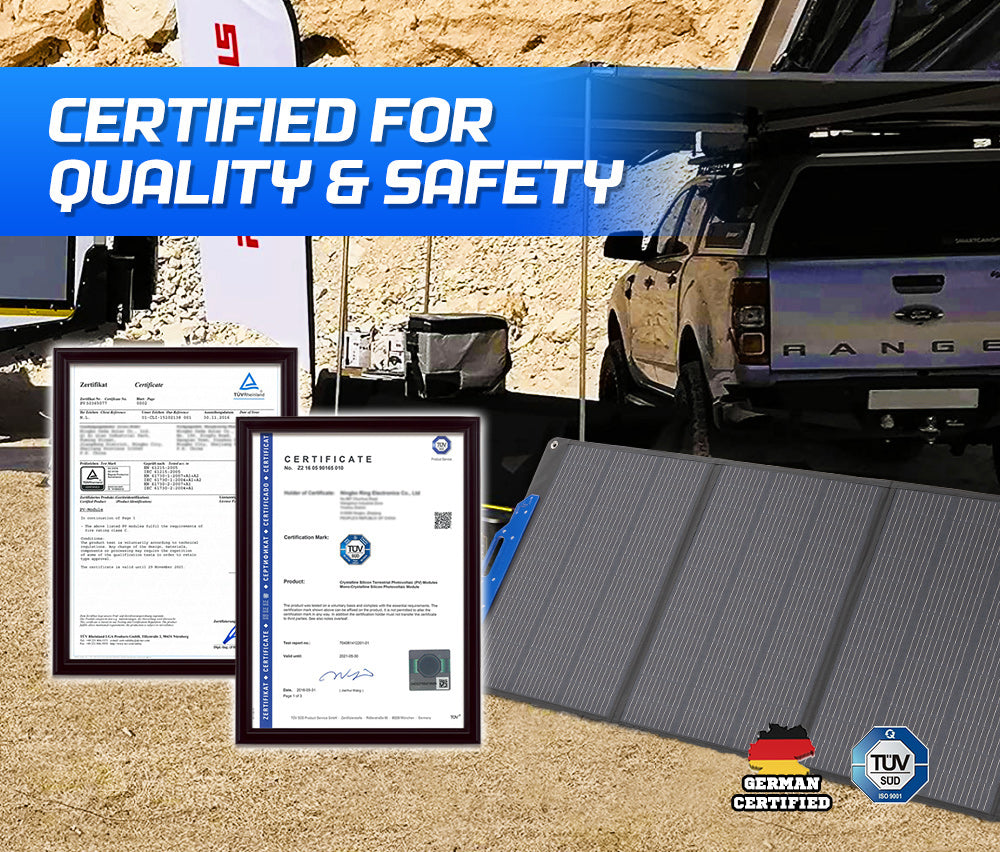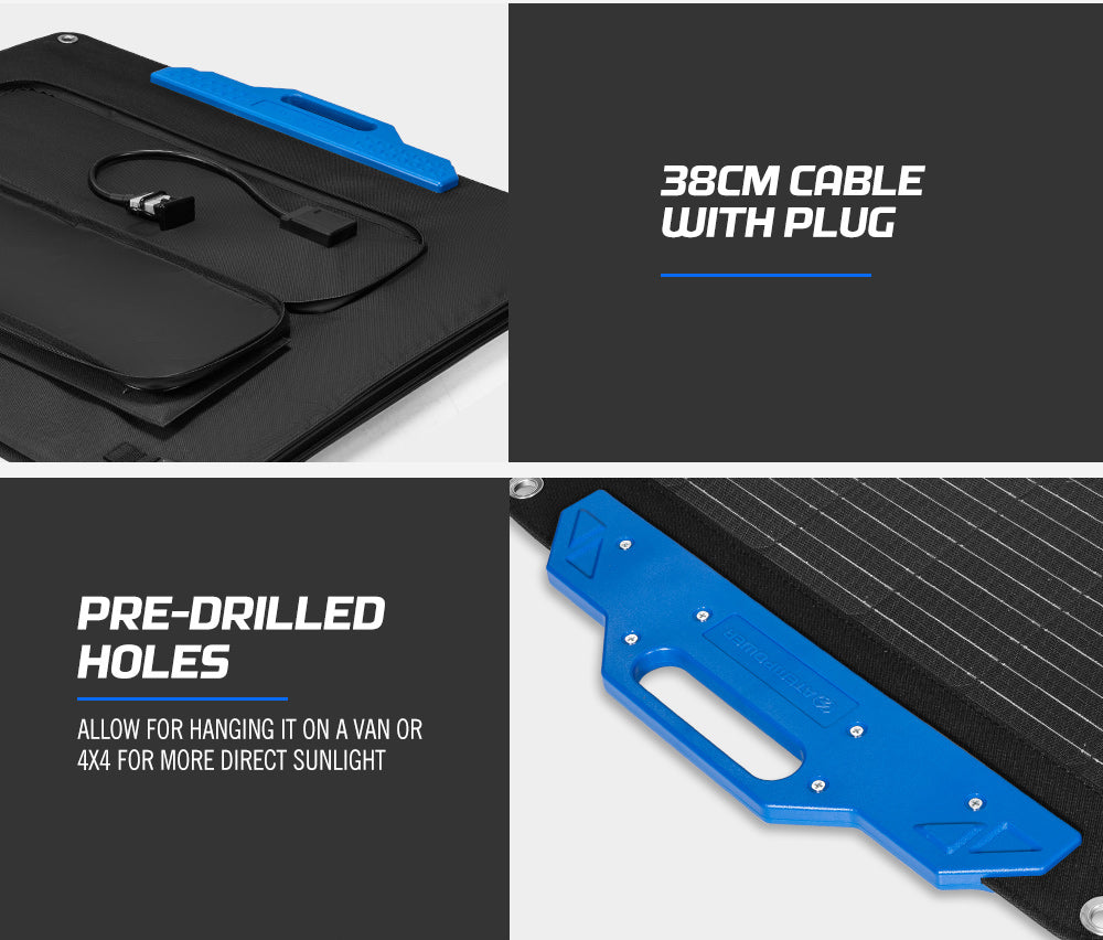 Whether you're camping in the rugged outback or soaking up the sun on a tropical island, our sleek 300W foldable solar panel ensures you remain powered up throughout your adventures. Weighing just 13.85kg and designed to fold neatly, it's your go-to, space-saving essential that cranks up the voltage on your adventures! Our foldable solar panel packs a punch with A Grade monocrystalline solar cells that achieve a 24% energy conversion efficiency. This means you get more energy with every cell. Thanks to the ETFE tech, our solar panel features faster charging speeds. And with adjustable kickstands, you can ensure your solar panel is always in the best position to absorb sunlight. It also features an auto-optimization function that achieves immediate re-connection when sunlight returns.With the MPPT controller, you'll get 20% more energy than a PWM controller. Power up wherever, whenever with ATEM POWER 300W foldable solar panel!