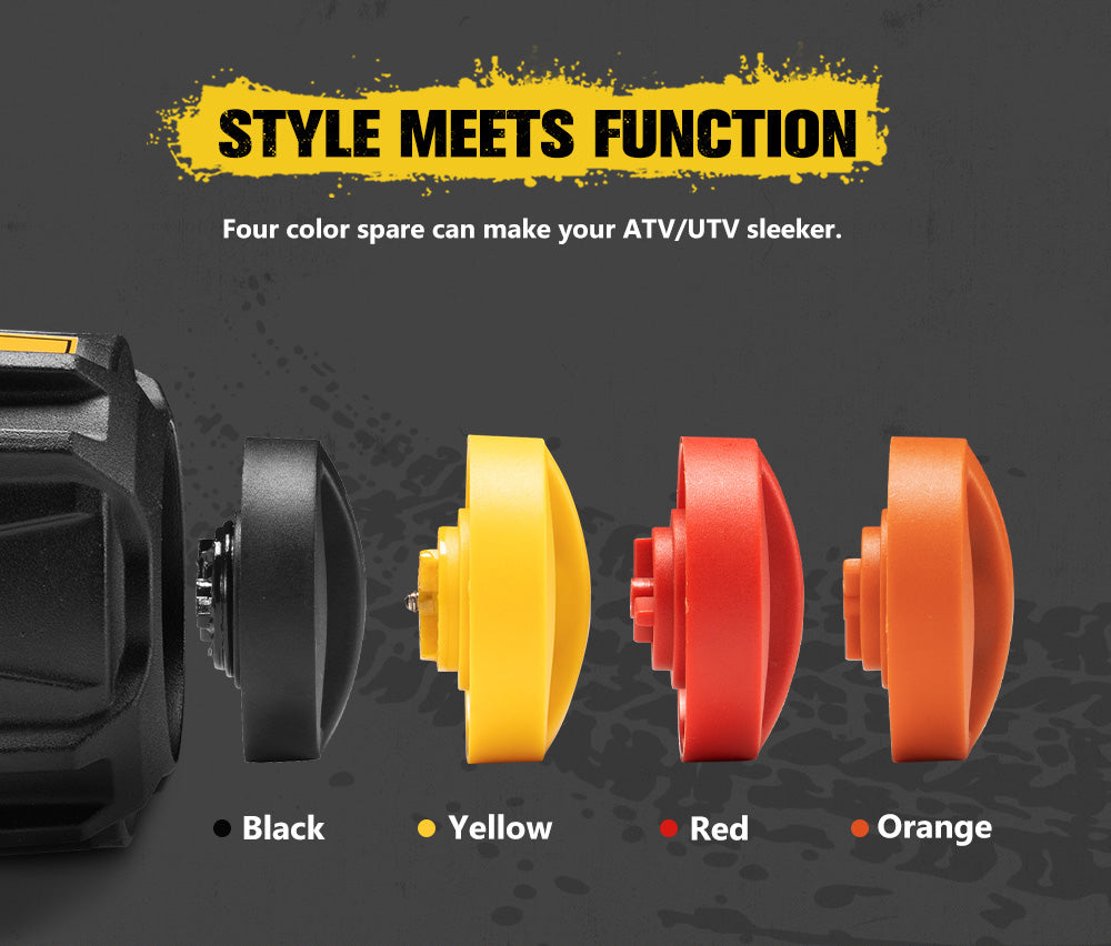 For those off-road enthusiasts who crave exploring the wilderness, it's not a question of "if," but "when" you'll get stuck. That's where our BUNKER INDUST 6,000lbs electric winch can bail you out. When things get sticky, whether for you or your buddies, unleash its pulling power to save the day. Equipped with a 3.2HP permanent magnet motor, it's connected to a 3-stage planetary gear system boasting a 192:1 gear ratio. This configuration ensures enhanced pulling power and faster line speed. Our ATV winch/electric winch features an aluminum housing with UV-resistant finish. Its IP67 rating defies harsh outdoor conditions. Installation is a breeze with its bolt-on design, tailored for UTV/ATV. The automatic braking system will secure you on the steepest slopes. The remote controller also comes with integrated LED lights, which can double as a work light. Moreover, our clutch caps are available in yellow, orange, red, and black, enabling you to choose the color that fits your rig.