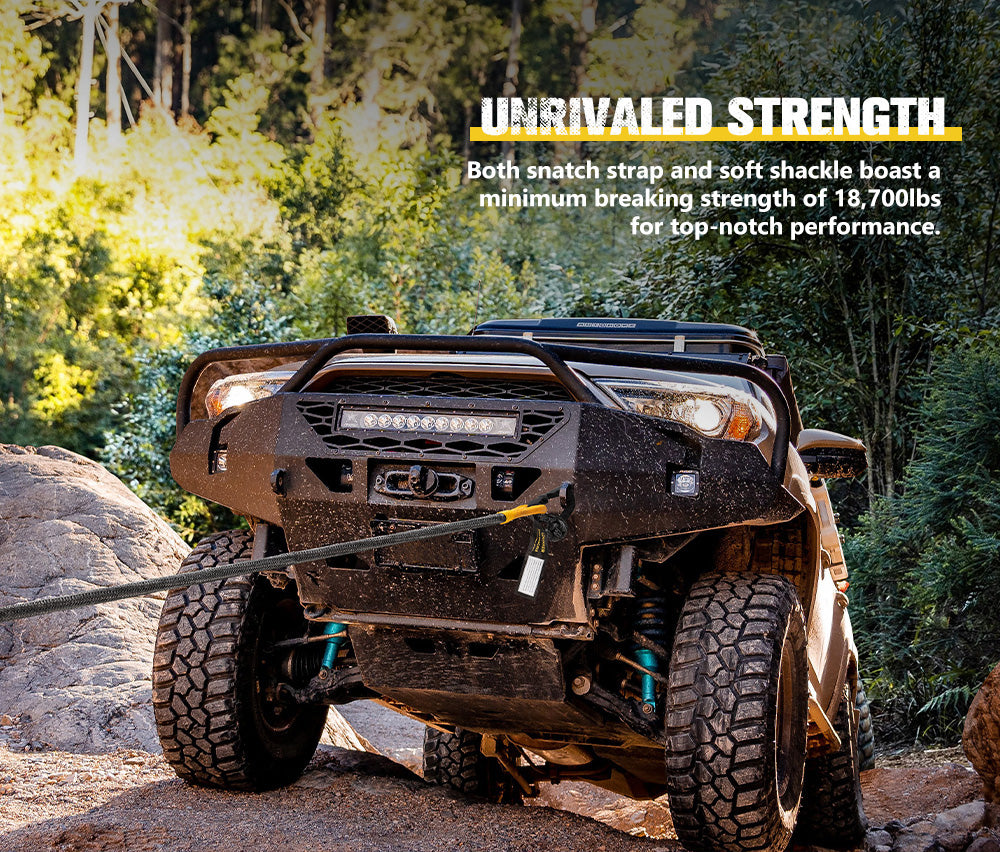 • Exceptional Breaking Strength: With a minimum breaking strength of 8,482kg, our kinetic recovery rope and soft shackle excel in the toughest situations.