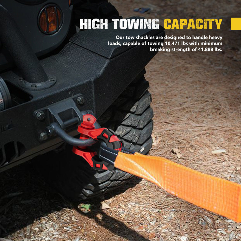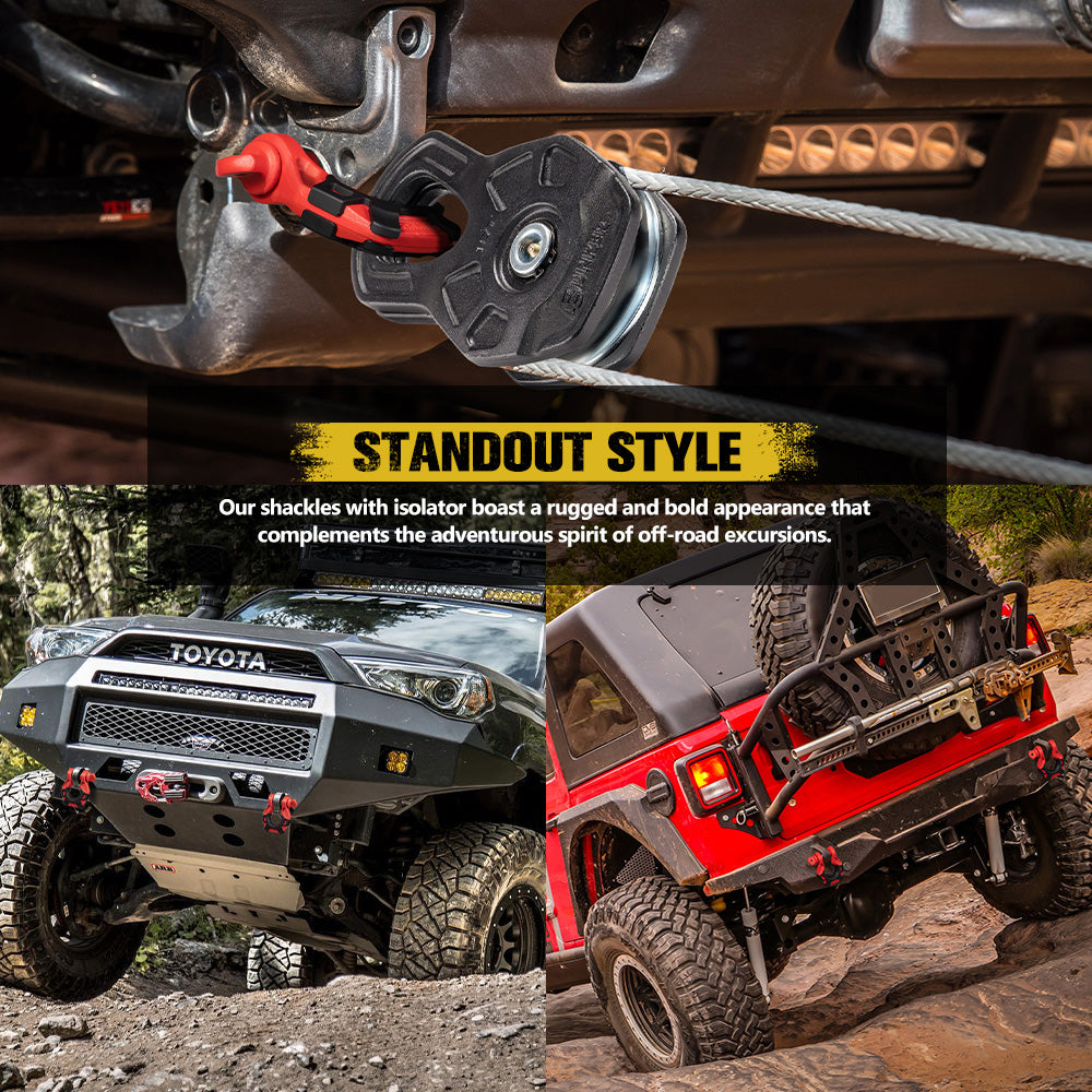 With robust working load limit of 4.75T, our tow shackles are built for tough off-road challenges, whether it's towing a 4x4 or truck out of deep mud, sand dune, or rocky trails. The isolators are crafted from soft, durable TPU, fully wrapping the shackles to reduce rattling noise and enhance vehicle protection. Our D ring shackles, made of drop forged steel, offer robust support for demanding recovery operations. Their premium powder coating ensures lasting protection against corrosion, preventing rust and deterioration over time. And this coating guards against fading, preserving the bow shackles’ appearance and visibility even under direct sunlight and exposure to outdoor elements. The robust 1.91cm screw pins offer enhanced safety with their secure locking mechanism, and facilitate straightforward attachment and detachment of the recovery shackles. The rugged style enhances your vehicle's aesthetics, ideal for adventurous excursions.