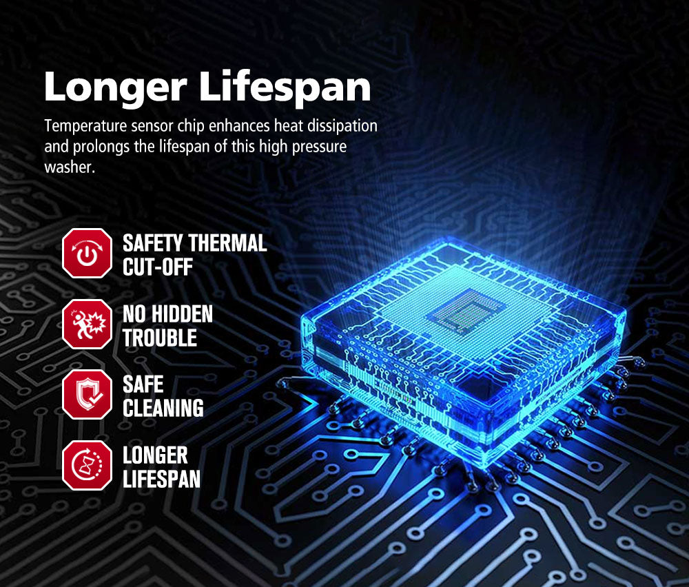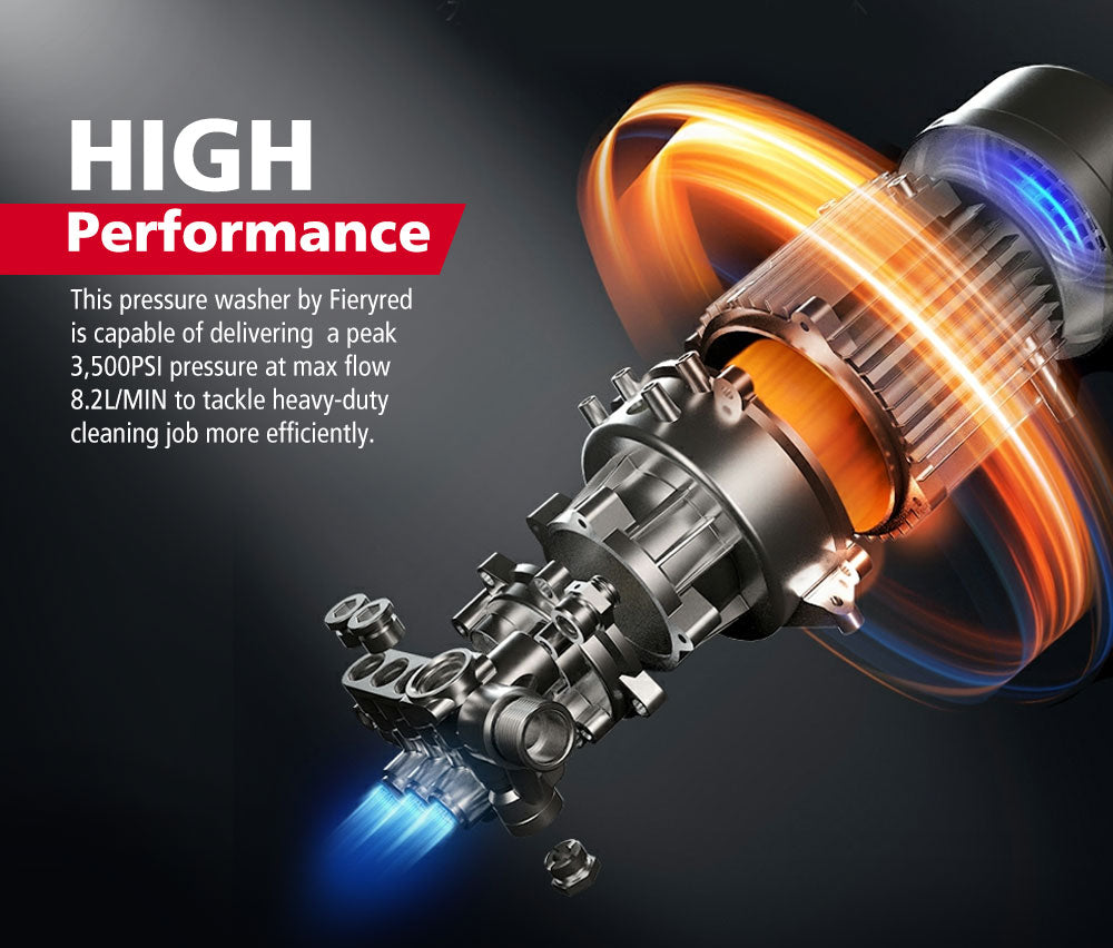 • Refined Design: With a quick hose connection, secure gun lock, and a sturdy leg, our Fieryred high-pressure washer is built for greater ease and performance.