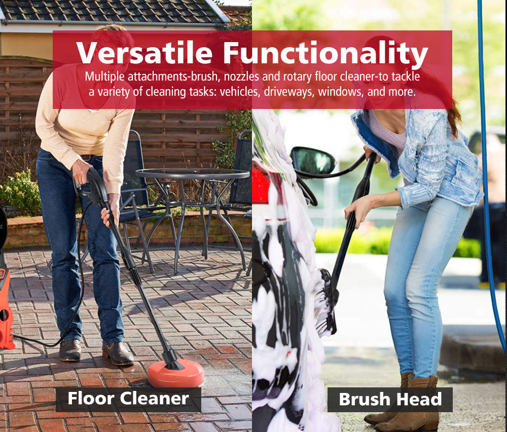 • All-in-One Cleaning: Tackle everything from vehicles, driveways to windows with ease using our high pressure washer’s brush, lance, and patio cleaner.