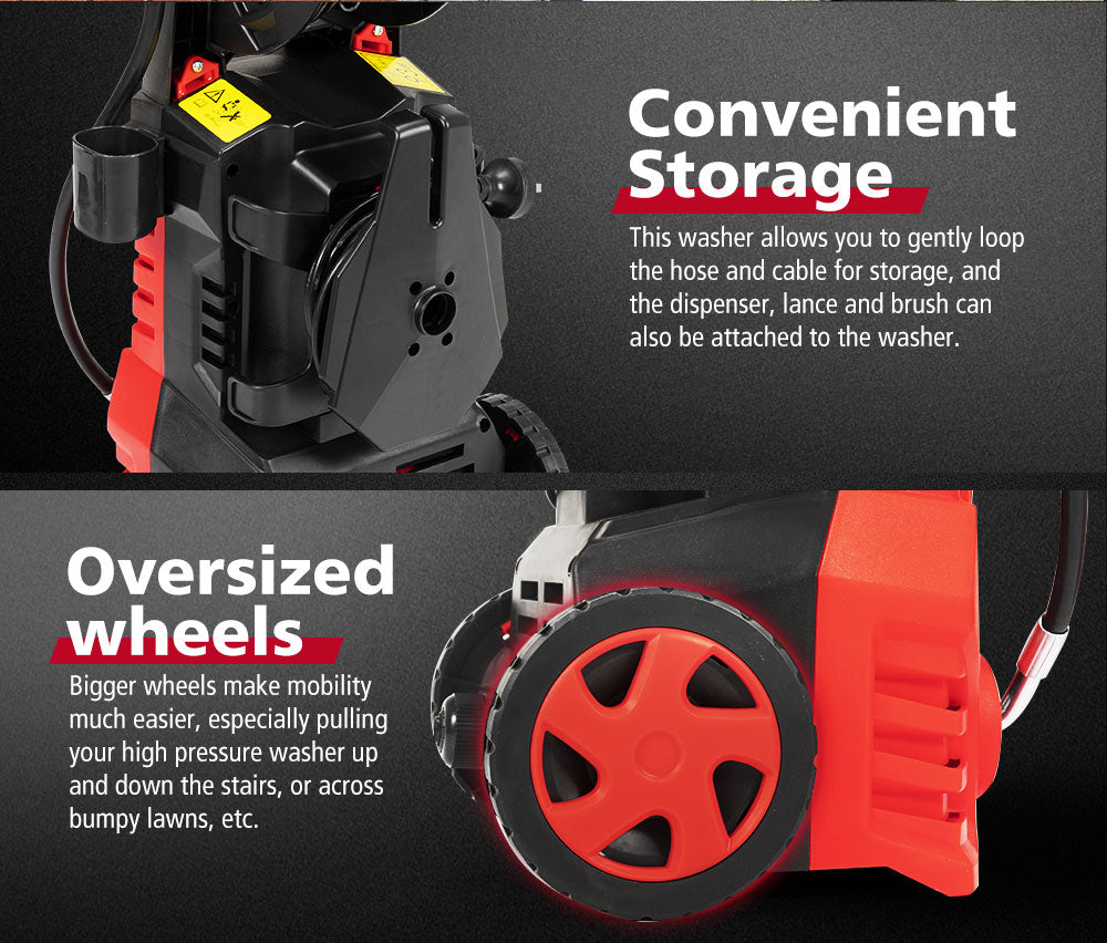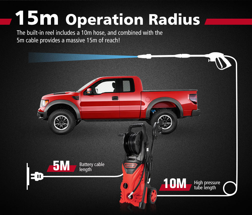 • Massive Reach: The built-in reel of our high pressure washer includes a 5m hose, and combined with the 5m cable provides a massive 10m of reach!