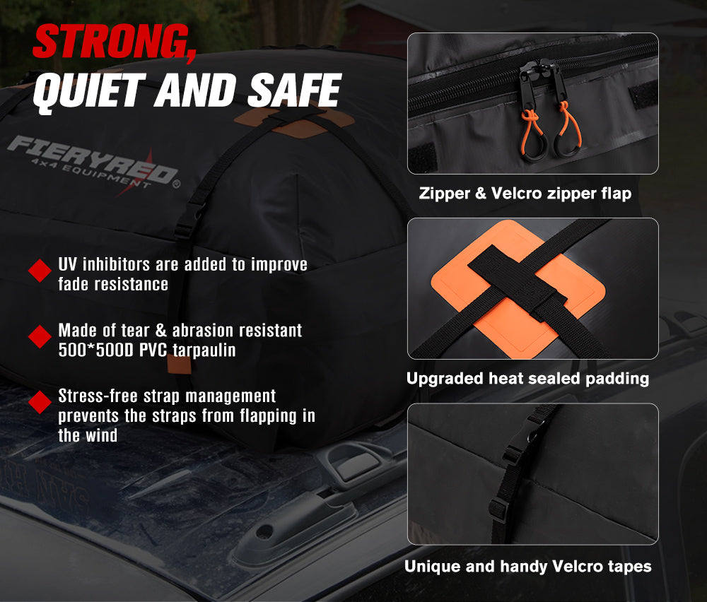• Universal Fitment: This FIERYRED rooftop cargo bag is suitable for nearly all vehicles with or without side rails or crossbars.