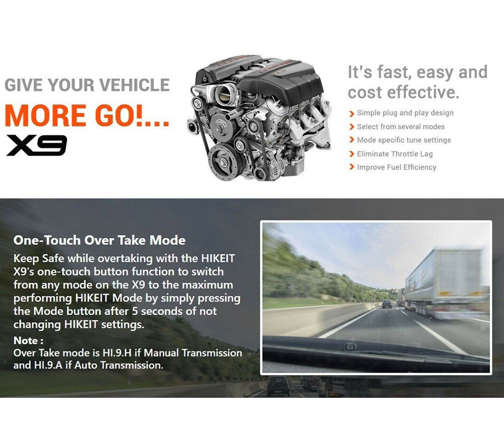 Sick of the delay you get when pushing your accelerator pedal?HIKEit has a solution to get rid of that pedal lag! The HIKEit X9 Throttle Controller is the most advanced controller on the market and designed specifically To "wake up" your car by reducing throttle lag and improving the response time from your vehicle's "fly by wire" accelerator. Best of all, the X9 is Plug & Play! The HIKEit X9 is a 'bite-size' throttle response controller that removes delays in your electronic accelerator pedal. In short, the X9 will get a faster response from your engine and therefore you'll get a modified acceleration depending on the X9 setting you select. In addition to Auto IQ mode which will intelligently learn your driving style and the current situation and adapt the mode to suit, the X9 has 4 different control modes: Eco/4x4, Cruise, Sport/Tow, and the Highest Performance mode, HIKEit mode.