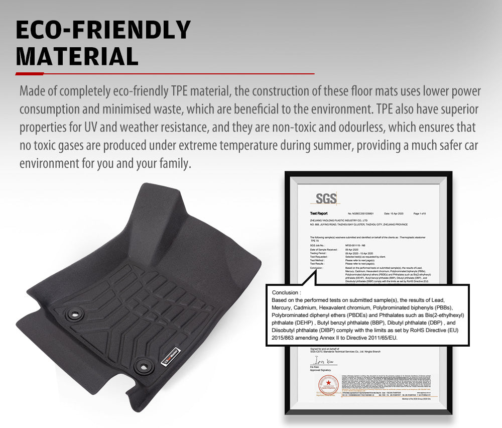 • Built to Last: Made of TPE, our floor mats are extremely durable and can withstand harsh conditions, including tearing, abrasion, exposure to UV & chemicals.