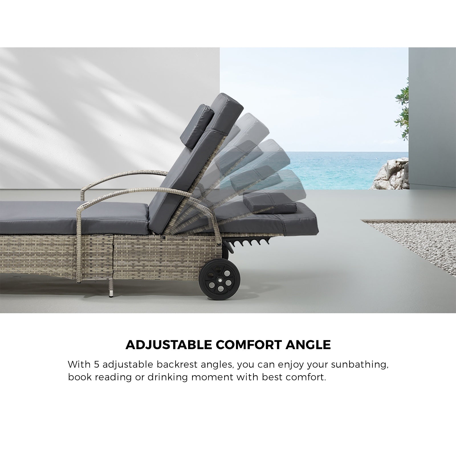 Introducing the new Livsip Sun Lounge, complete with luxurious armrests, elevating your outdoor relaxation experience to new heights! This sleek and stylish sun lounge is designed with your comfort in mind, offering the perfect combination of style and functionality. With its integrated armrests, this sun lounge provides exceptional support for your arms and upper body, allowing you to fully unwind and indulge in a moment of pure relaxation. Whether you're enjoying a refreshing beverage, reading your favorite book, or simply basking in the sun, the armrests add an extra level of comfort to enhance your lounging experience. Not only does this sun lounge offer supreme comfort, but it also delivers unmatched convenience. Equipped with smooth-rolling wheels, you can effortlessly glide your lounge to your desired location, whether it's on your patio, by the poolside, or even down to the beach.