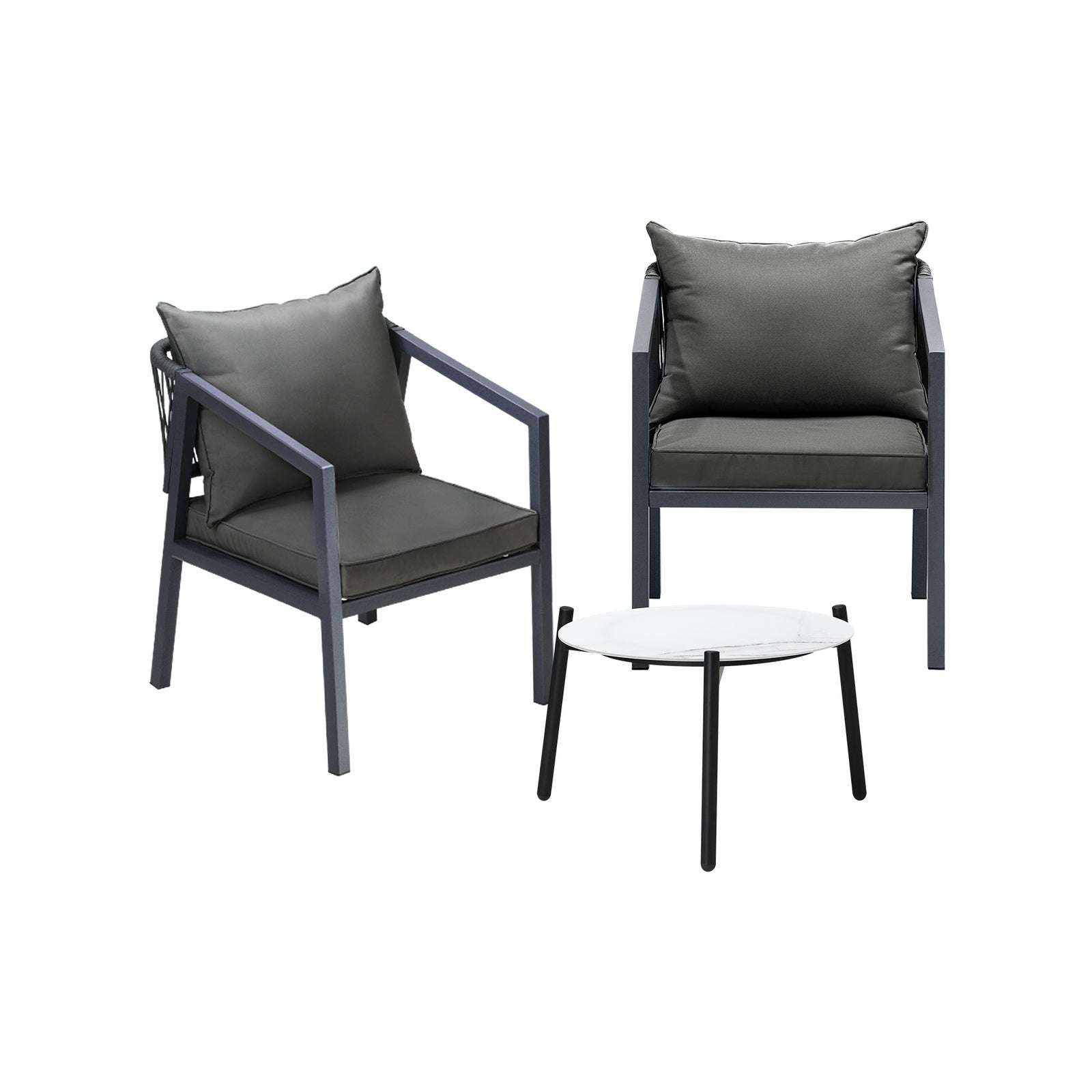 If you are looking for a classy and sophisticated outdoor set that adds a touch of marble-resque aesthetics to its setting, then this Livsip Outdoor Set is well within your radar of stylish furniture. None the ordinary and everything the exceptional. With its glassy marble-like finish, the 5mm thick coffee table top signifies an intention to up the elegant factor while enjoying your tete-a-tete with friends and family over drinks and snacks, or simply appreciating its captivating presence in your home. Design-wise, the three-legged profile of the coffee table is unique in stature while extending its durability and strength with a black powder-coated steel construction. Equally enticing, the outdoor chairs will form a fine complement to the ensemble to create a very pleasing social focal point of relaxation and leisure. The chair match-ups with the coffee table are resplendent with style with every configuration that you desire.