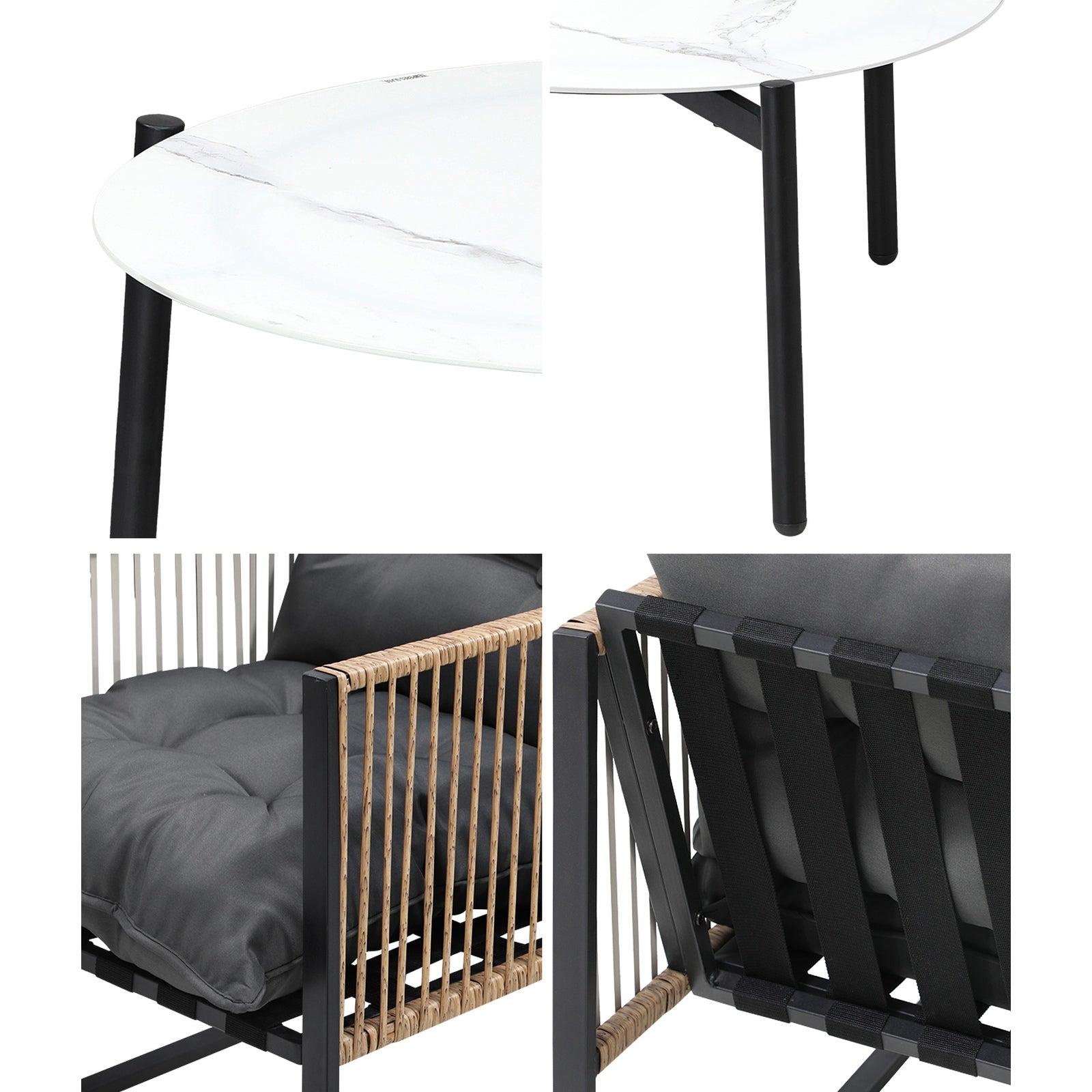 If you are looking for a classy and sophisticated outdoor set that adds a touch of marble-resque aesthetics to its setting, then this Livsip Outdoor Set is well within your radar of stylish furniture. None the ordinary and everything the exceptional. With its glassy marble-like finish, the 5mm thick coffee table top signifies an intention to up the elegant factor while enjoying your tete-a-tete with friends and family over drinks and snacks, or simply appreciating its captivating presence in your home. Design-wise, the three-legged profile of the coffee table is unique in stature while extending its durability and strength with a black powder-coated steel construction. Equally enticing, the outdoor chairs will form a fine complement to the ensemble to create a very pleasing social focal point of relaxation and leisure. The chair match-ups with the coffee table are resplendent with style with every configuration that you desire.