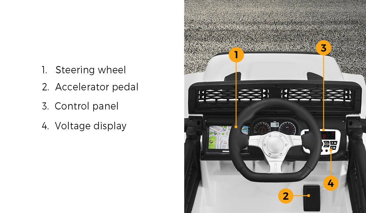 With its rugged looks, our MAZAM Ride On Car takes on a purposeful stance from any angle. Inspired by one of the most well-known 4x4s, our ride on car is a tribute to the real thing from ground up. The sculpted design with the iconic grille, striking headlights, big and wide tyres and a search light all indicate that this ride car is ready to provide thrilling enjoyment from the moment go. Powered by twin 12V 60W motors, the ride on car can run at speeds of 3km/h to 8km/h (depending on weight with a maximum weight capacity of 30kg) with ease. In car entertainment and riding control are also provided with an easy-to-use dashboard that includes a one-button start, light controls, horn button, high/low speed selection, forward/reverse motion, charging port, and built-in songs playback as well as MP3 connect for even more musical enjoyment. Note: It's advised to charge the battery every month when not in use.