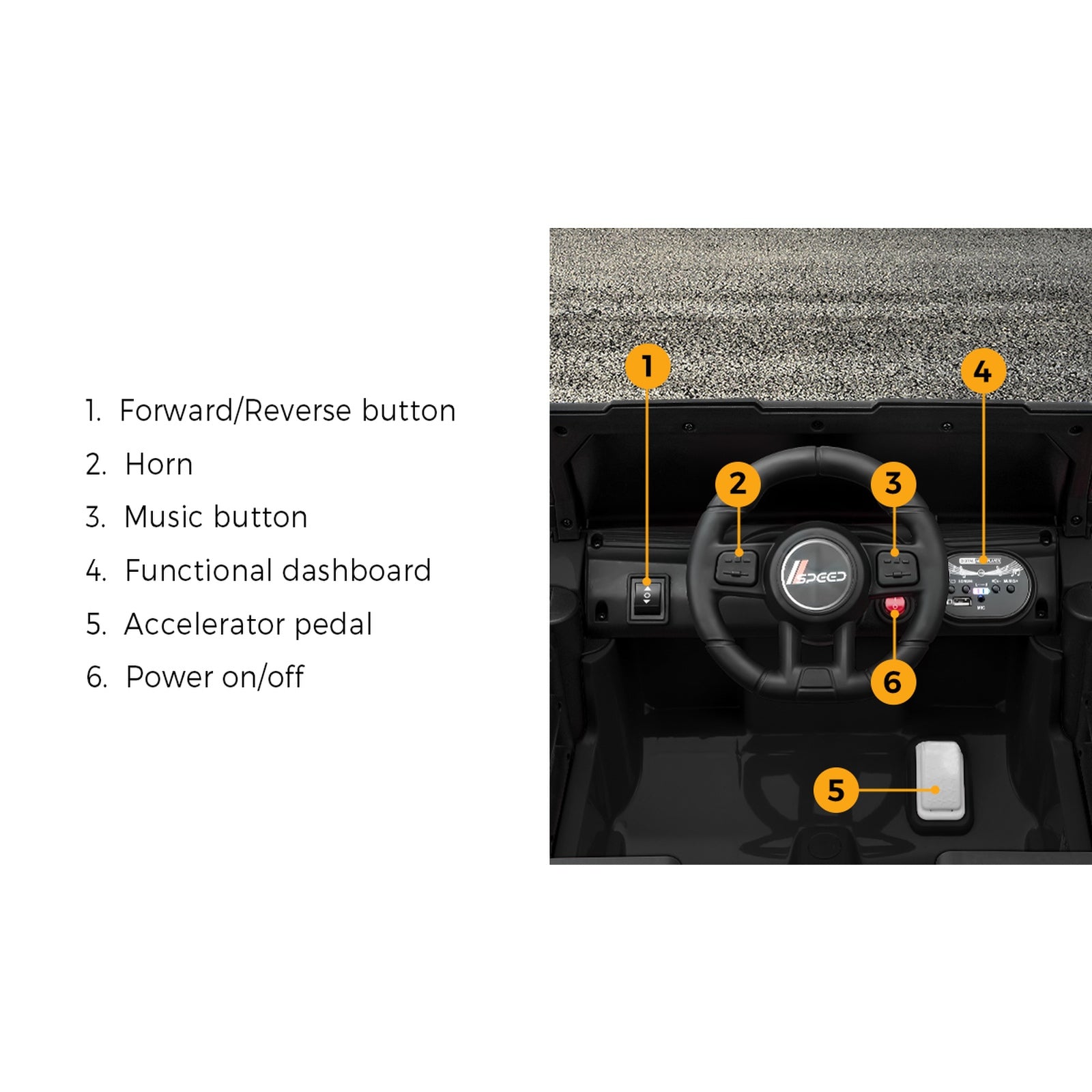 Fun on wheels. Thrills in motion. This Mazam Wrangler-inspired Ride On Car is ready to let your kid have exhilarating times with every drive. With its rugged profile, the vehicle is designed to deliver the looks and the passion. An iconic jeep-like body with flared fenders, striking headlights, chunky bumpers and brawny wheels and tyres, the vehicle also gets a simulated roll-over bar with twin decorative spotlights. The styling is definitely bold and formidable for any adventure on grass, gravel or concrete. Push the one-button start to fire up the twin 30W motors powered by a 12V4.5Ah battery to punch out a cruising speed of up to 5km/h (depending on user's weight) with its 3-speed control. No lack of safety either with a secure seat and seat belt, lockable doors and a unique soft-start system to make things safer for the young driver. Likewise, the ride is also made smoother with the 4-wheel suspension and anti-slip tyres.