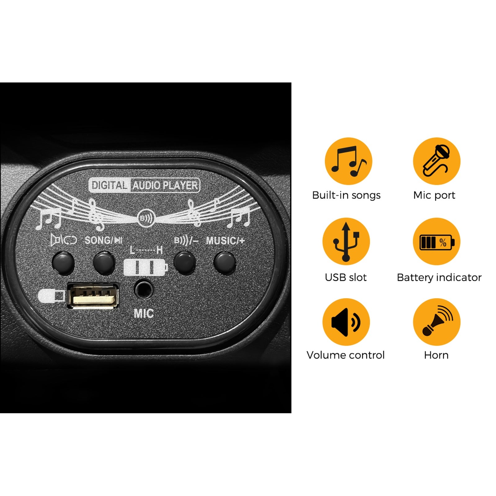 Fun on wheels. Thrills in motion. This Mazam Wrangler-inspired Ride On Car is ready to let your kid have exhilarating times with every drive. With its rugged profile, the vehicle is designed to deliver the looks and the passion. An iconic jeep-like body with flared fenders, striking headlights, chunky bumpers and brawny wheels and tyres, the vehicle also gets a simulated roll-over bar with twin decorative spotlights. The styling is definitely bold and formidable for any adventure on grass, gravel or concrete. Push the one-button start to fire up the twin 30W motors powered by a 12V4.5Ah battery to punch out a cruising speed of up to 5km/h (depending on user's weight) with its 3-speed control. No lack of safety either with a secure seat and seat belt, lockable doors and a unique soft-start system to make things safer for the young driver. Likewise, the ride is also made smoother with the 4-wheel suspension and anti-slip tyres.