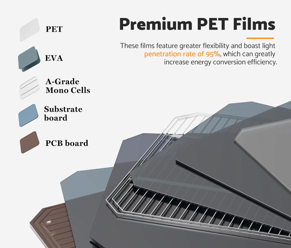 • Premium PET Films: These films feature greater flexibility and boast light penetration rate of 95%, which can greatly increase energy conversion efficiency.