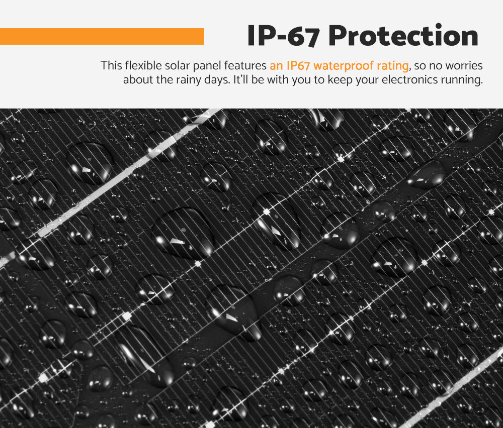 • IP-67 Protection: This flexible solar panel features an IP67 waterproof rating, so no worries about the rainy days. It’ll be with you to keep your electronics running.