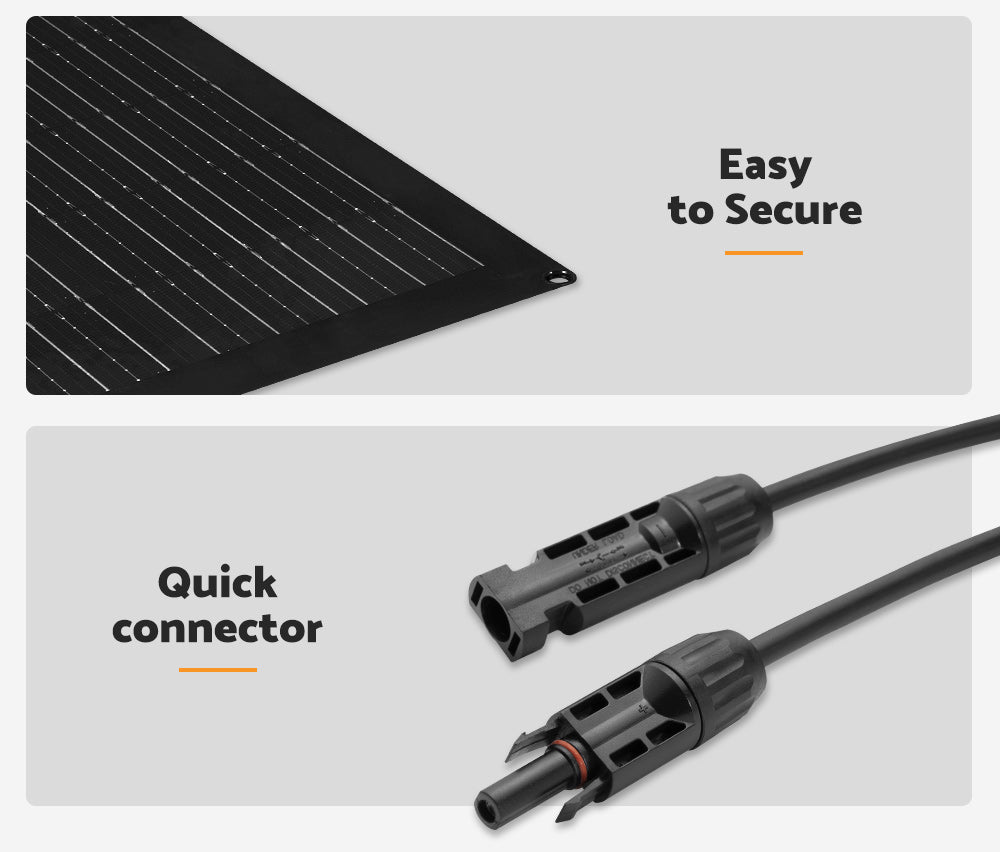 • Easy to Secure: The RV solar panel/flexible solar panel can be installed with adhesives and/or 4 reinforced mounting holes at each corner.