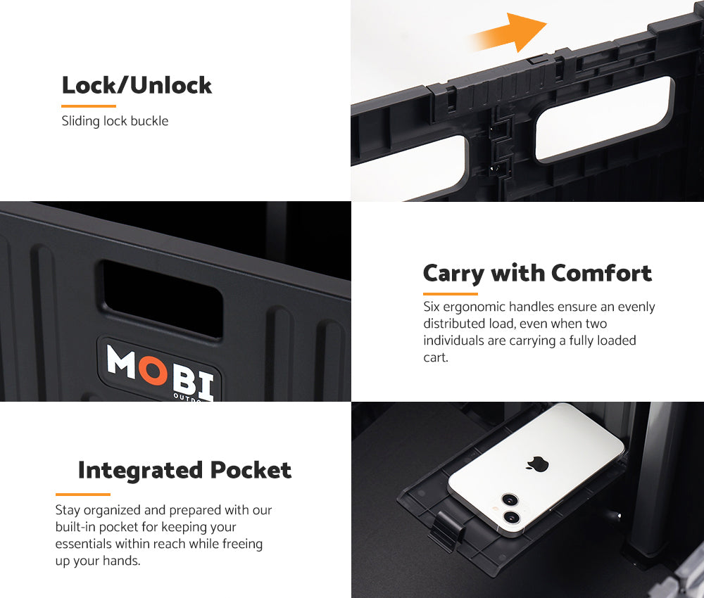 No matter how you like to spend your days off—whether it’s camping or enjoying a picnic—the Mobi foldable camping cart makes light work of heavy hauls. Compact and convenient, its collapsible design lets you simply pop it open, load up your gear, and go. Moving your gear has never been more enjoyable! Our camping cart has a 70L capacity to carry all your essentials. Removing the detachable hood creates even more space for additional items. Thanks to its four smooth-rolling 360-degree wheels, gliding through tight spaces is a breeze, even when fully loaded. Need it to stay put? Just engage the foot lock on the front wheels, and the cart holds steady. Crafted from reinforced PP, this cart resists scratches, impacts, and UV exposure, ready for whatever the outdoors throws your way. When the fun’s over, collapse it to a compact 50x44x9.5cm, fitting snugly into your car’s boot. With our camping cart, your outdoor excursions just got a whole lot easier!