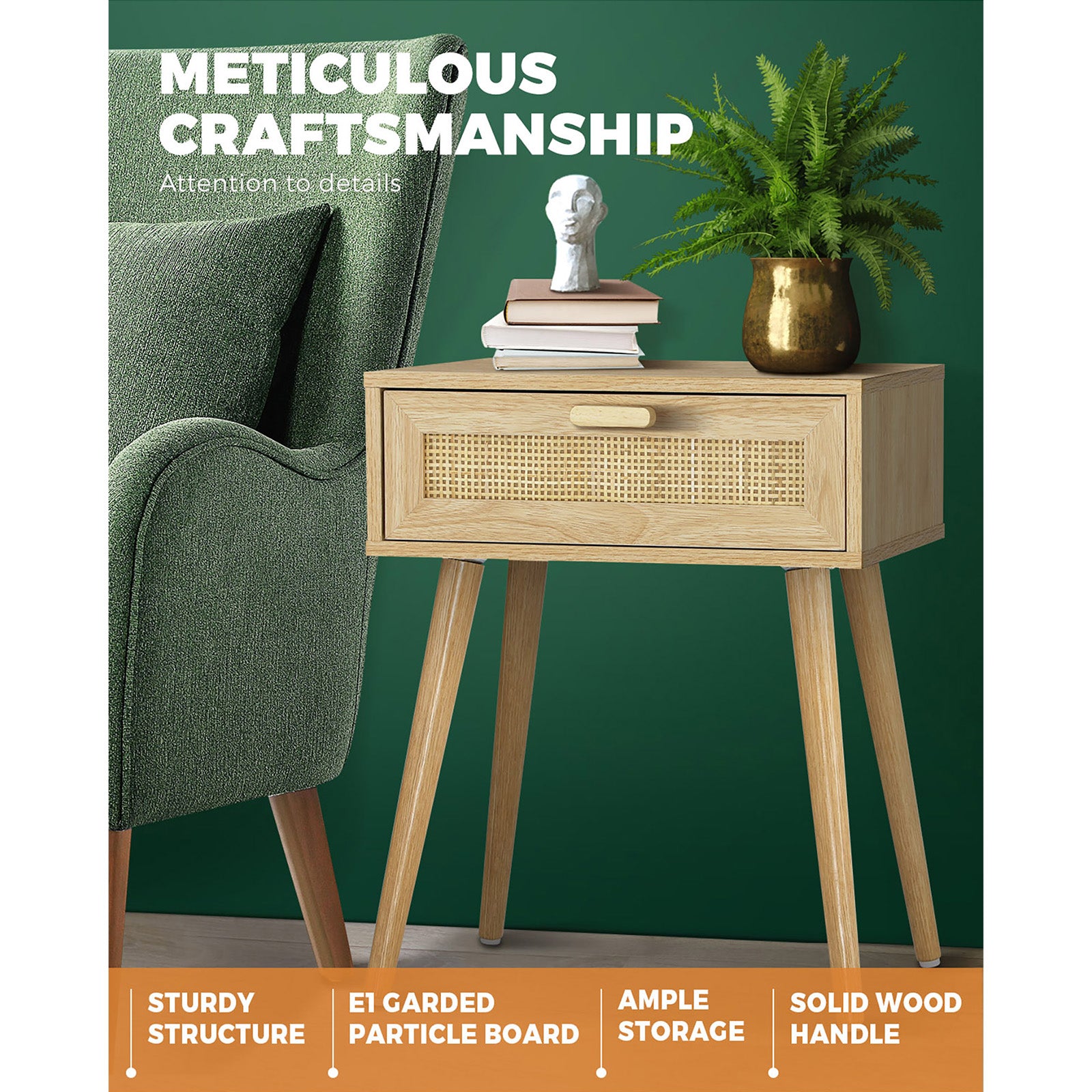 Oikiture Bedside Tables Drawers Rattan Wood Storage Cabinet Nightstand Bedroom