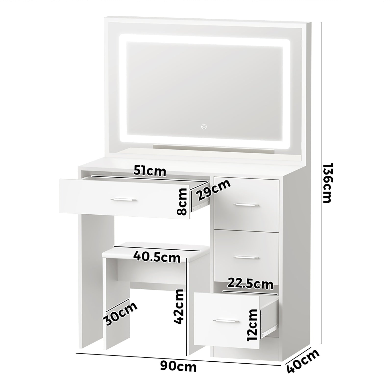 Dressing table dimensions:90cm x 40cm x 136cm