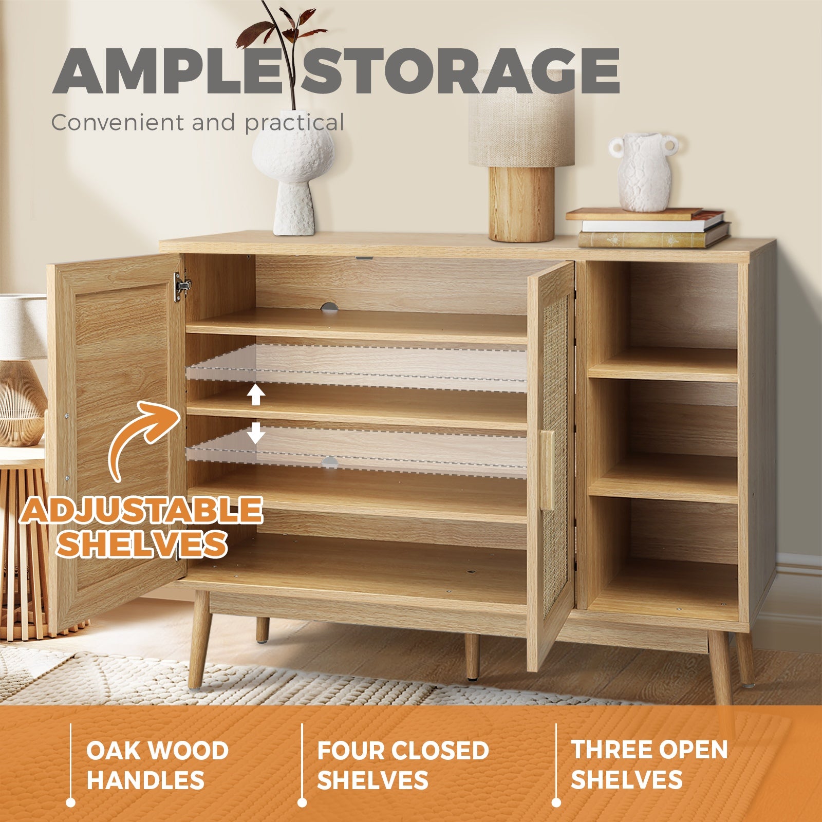 • Four closed shelves and three open shelves