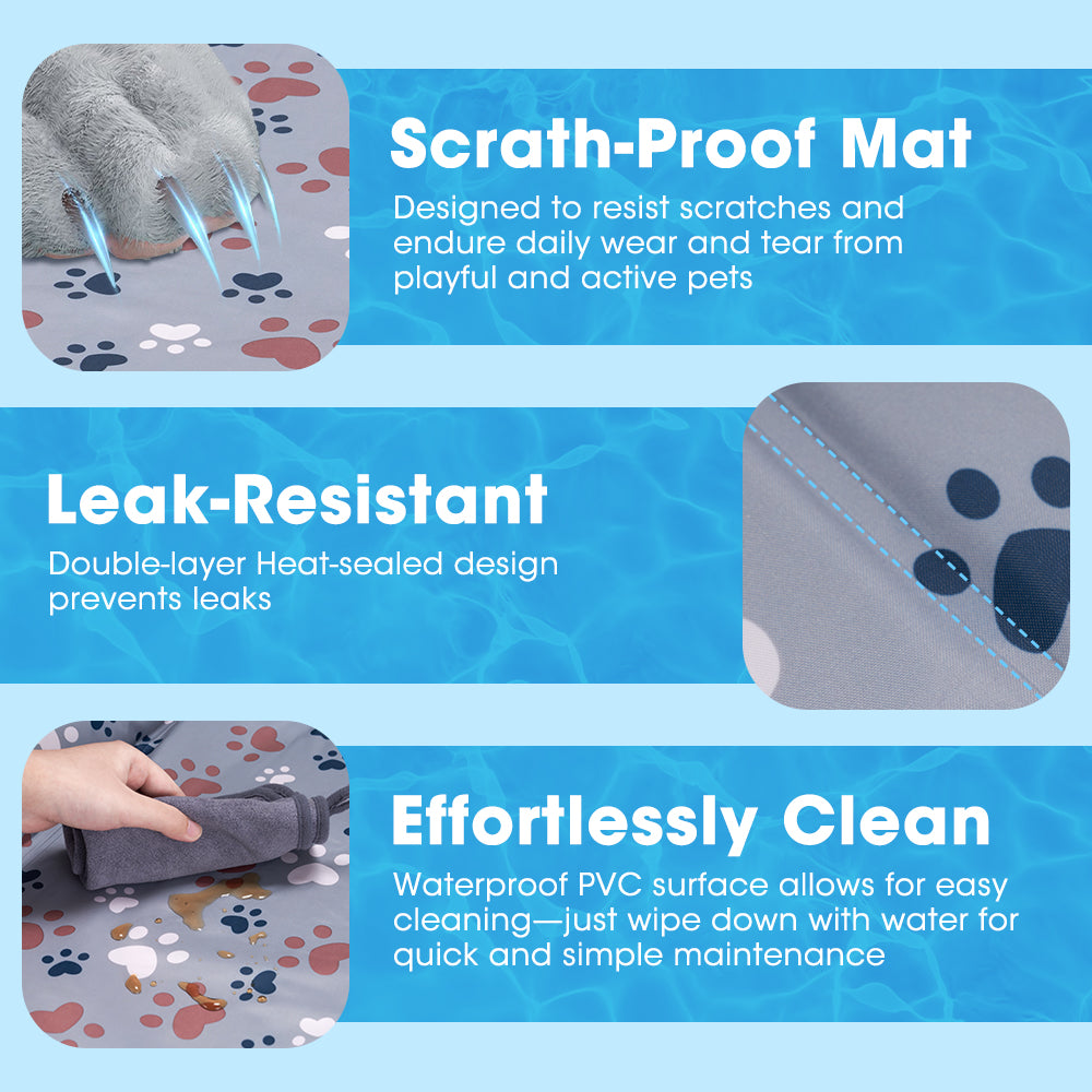 Pets naturally seek cooler surfaces to lie on when it’s hot, so providing a cooling mat is a great way to help them stay cool. Imagine your pets relaxing on our soft, cooling mat instead of struggling in the heat—whether they’re lounging in the sun or in their crate. Every nap becomes a cool, comfortable retreat! Chill out quickly—our pet cooling bed’s gel beads activate instantly to draw away heat, while the 15-minute recharge ensures it’s ready for your pet’s next break. Unlike damp spots that cause skin and joint discomfort, the gel cooling technology offers a healthier, worry-free comfort for your pet. Whether your pet is relaxing at home, traveling in the car, or dozing in their crate, the foldable, leak-proof design ensures consistent comfort wherever they go. Our waterproof, scratch-resistant PVC surface also makes cleanup a snap—just wipe with water and dry with a towel. Wherever the day leads, Petzly pet cooling mats keep your pet relaxed, refreshed, and ready for more fun!