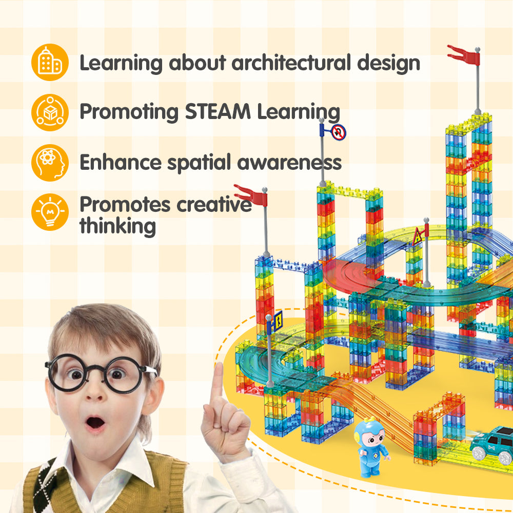 • Track Builder: Create diverse race car tracks with magnetic blocks—straight paths, curves, flat-top arches, and ramps. Enjoy imaginative play and endless building fun!