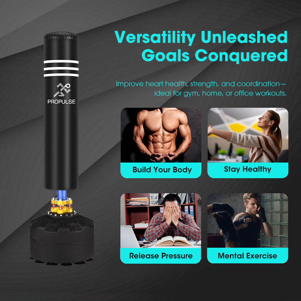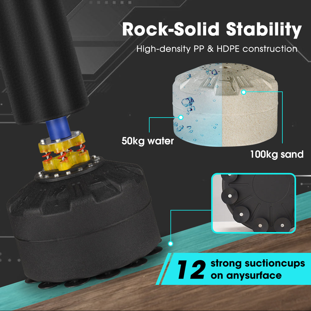 Fret about the crowded gym to wait for your turn or feel rushed during your workout? With our ProPulse freestanding punching bag, you can kiss those worries goodbye. It is designed to instantly transform your home into a personal gym, allowing you to boost your speed, endurance, and power on your own schedule. Our ProPulse freestanding speed kick not only features a shock-absorption system with dual PVC shock absorbers and four carbon steel springs to reduce noise and absorb shocks, but 12 suction cups to securely affix the base to the ground. The springs also give the bag provide a degree of "rebound" to respond to forceful punches. The bag is constructed with four layers: high-density PU leather, shock absorber, durable EPE foam, fabric buffer, providing durability against powerful strikes while offering excellent shock absorption and rebound. Its base, fillable with water or sand, acts as a stable anchor, ensuring stability during intense training sessions.
