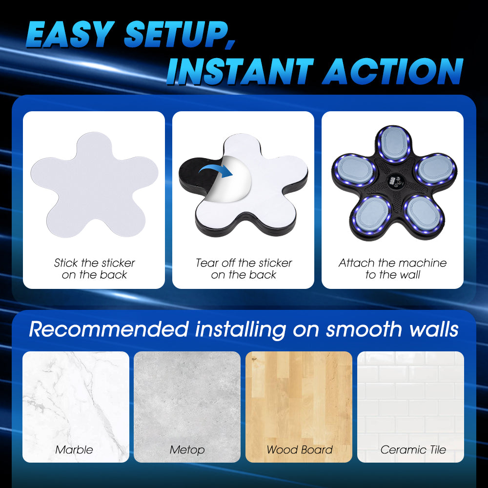 • Quick Setup: Simply stick the kids music boxing to any wall using the adhesive—no drilling, just secure attachment on wood, brick, or tile for a hassle-free workout.