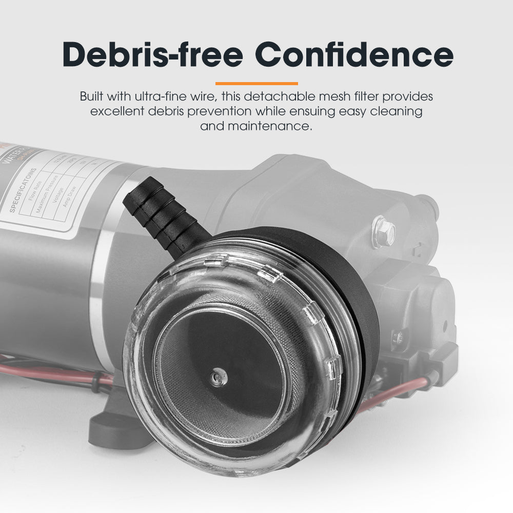 After a long day of traveling in your caravan, you arrive at your campsite and set up for the night. The last thing you want is to struggle with inefficient water sources for cooking or cleaning. Our 12V water pump is lightweight, compact, and ensures a steady water supply, making your camping experience hassle-free. No extra switches or manual effort are needed—our water pump automatically activates at the turn of a tap or flush valve, making your setup effortless and convenient. Its moderate flow rate provides a steady water supply for various applications, whether you’re camping or gardening. Outdoor water sources can clog your pump with debris, but our mesh filter solves this. Its ultra-fine wire and detachable design capture dirt effectively, ensuring clean water flow and easy maintenance. Still bothered by noisy, vibrating water pumps? Our 12V water pump’s anti-vibration feet minimize noise and movement, ensuring a quieter operation, enhanced stability, and a longer lifespan.