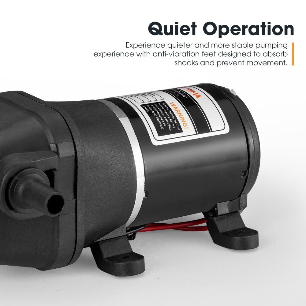 • Moderate Flow: With a steady flow of 12.5 L/min, this water pump caters to larger water demands, such as RVs, portable shower setups and irrigation systems.