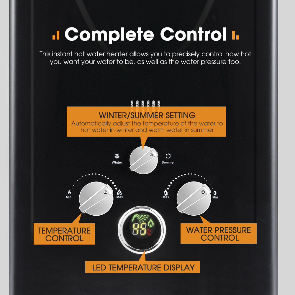 • Gas Water Heater-Complete Control: This instant hot water heater allows you to precisely control how hot you want your water to be, as well as the water pressure too.
