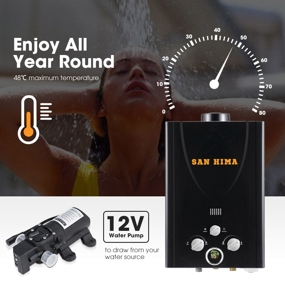 • Gas Water Heater-Instant Hot Water: The SAN HIMA gas hot water system provides instant hot water up to 8 L/M as long as you have a water source & gas bottle.