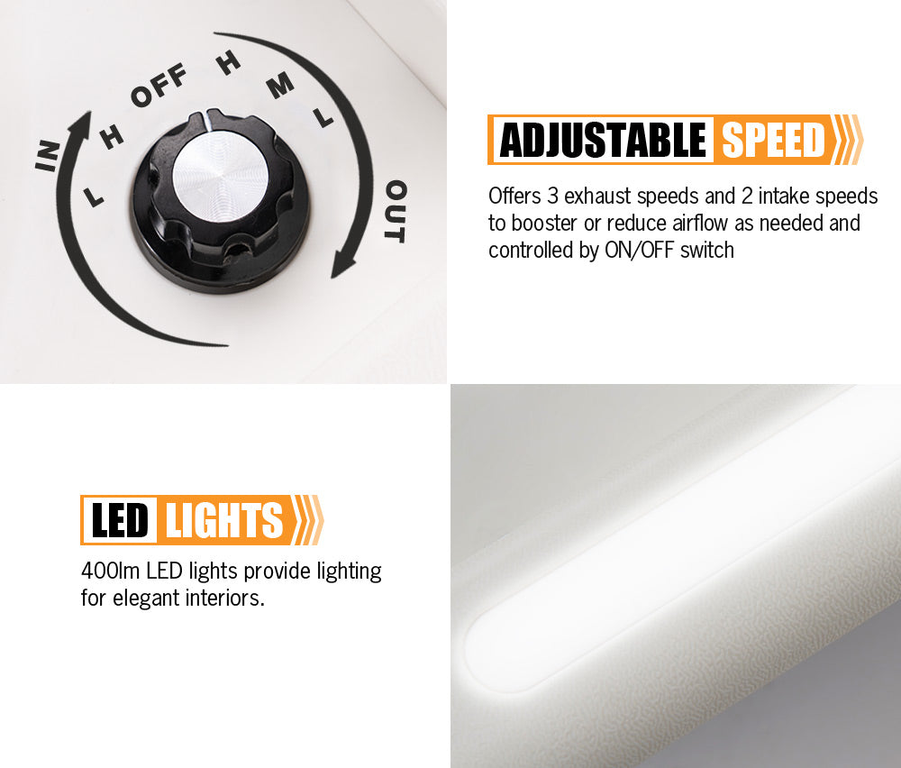 • Custom Airflow: Choose from 2 intake or 3 exhaust speeds to match your needs. Whether it’s a gentle breeze or strong ventilation, just turn the knob to adjust.