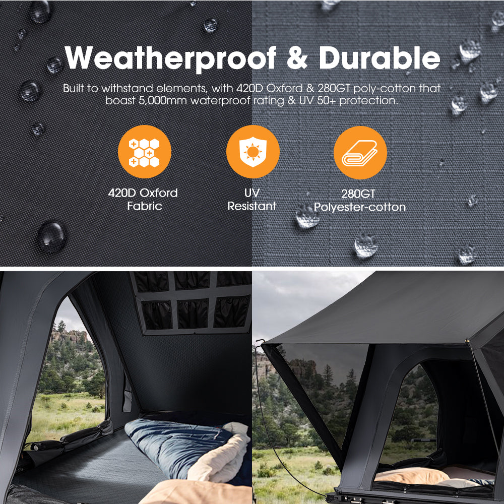 • Sturdy Build: Made of 420D double ripstop Oxford Fabric & 280GT Polyester-Cotton, our RTT offers an impressive 5,000mm waterproof rating and UV 50+ protection.