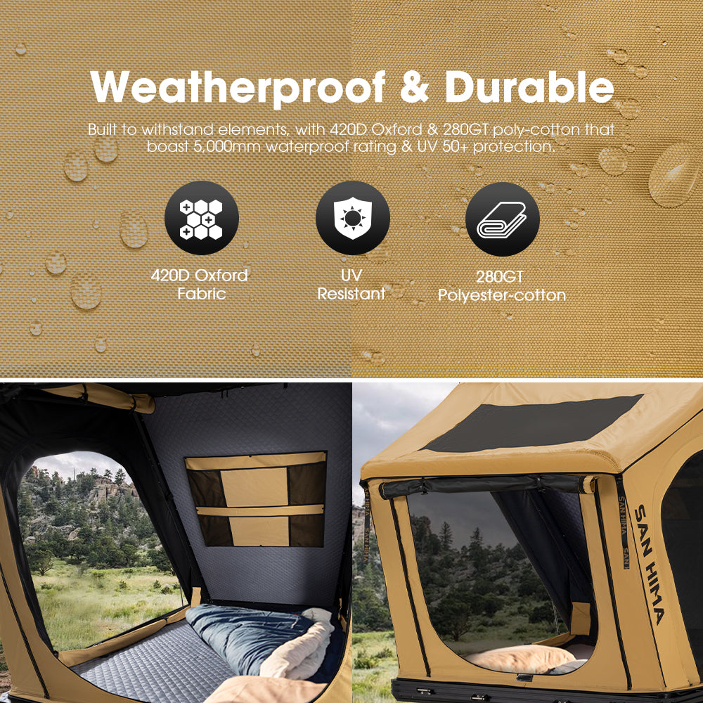 Whether you're heading out for an overlanding adventure or a weekend escape, the Kalbarri Gen 2 rooftop tent is here to elevate your journey with comfort and spacious interior. Designed to brave any season and condition, this hardshell rooftop tent tent ensures you enjoy every moment of your camping experience. With a skyview window that brightens your space and offers stunning views of starry nights, your evenings will be filled with romance and wonder. The AquaShield coating guards against UV rays, water, and corrosion, delivering long-lasting protection. Made from durable 420D Oxford fabric and 280GT polyester-cotton, it features a 5,000mm waterproof rating and UV 50+ protection, keeping you dry and comfortable in any weather. The tri-color LED strip light transitions from bright white to warm sunlight to mosquito-repellent amber, creating the perfect ambiance. Plus, our cloud memory foam mattress ensures a sound sleep, so you wake up refreshed and ready for adventure.