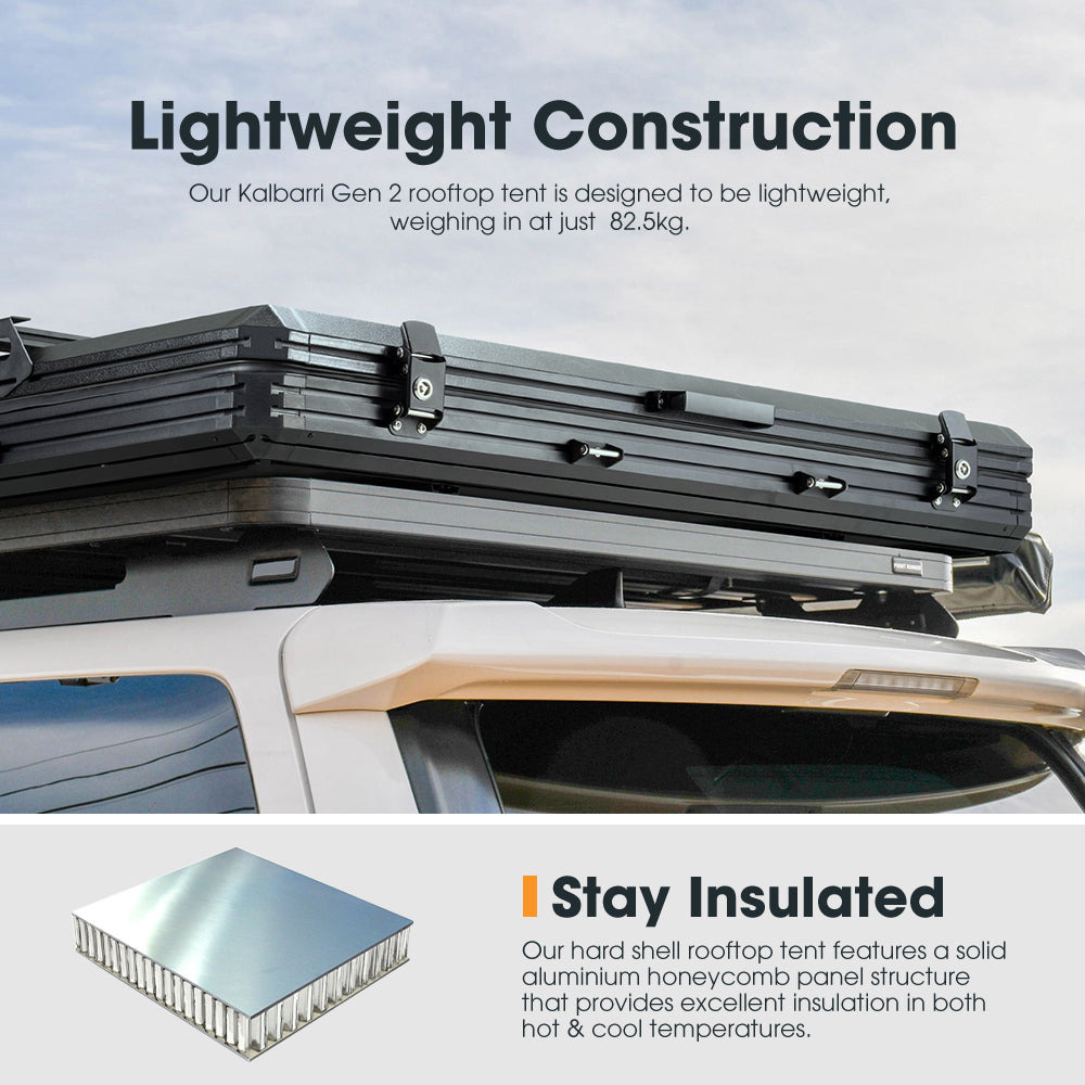 Whether you're heading out for an overlanding adventure or a weekend escape, the Kalbarri Gen 2 rooftop tent is here to elevate your journey with comfort and spacious interior. Designed to brave any season and condition, this hardshell rooftop tent tent ensures you enjoy every moment of your camping experience. With a skyview window that brightens your space and offers stunning views of starry nights, your evenings will be filled with romance and wonder. The AquaShield coating guards against UV rays, water, and corrosion, delivering long-lasting protection. Made from durable 420D Oxford fabric and 280GT polyester-cotton, it features a 5,000mm waterproof rating and UV 50+ protection, keeping you dry and comfortable in any weather. The tri-color LED strip light transitions from bright white to warm sunlight to mosquito-repellent amber, creating the perfect ambiance. Plus, our cloud memory foam mattress ensures a sound sleep, so you wake up refreshed and ready for adventure.