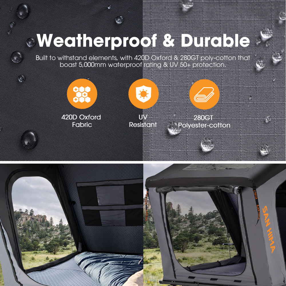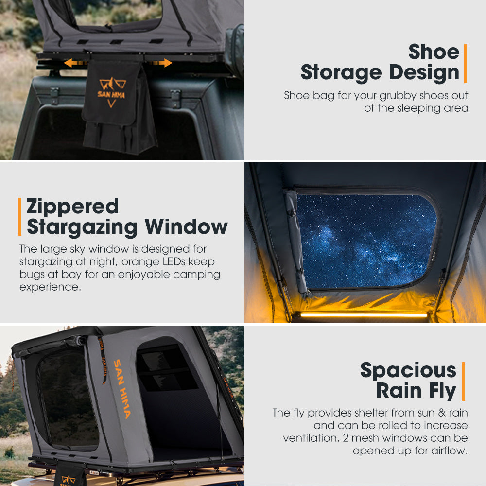 • Shelter from Elements: Our spacious rain fly provides excellent protection from the sun and rain. Two mesh windows can also be opened for additional airflow. *NOTE: Always thoroughly dry your rooftop tent after each use, avoid storing it in a damp environment, and ventilate regularly if unused for long periods.