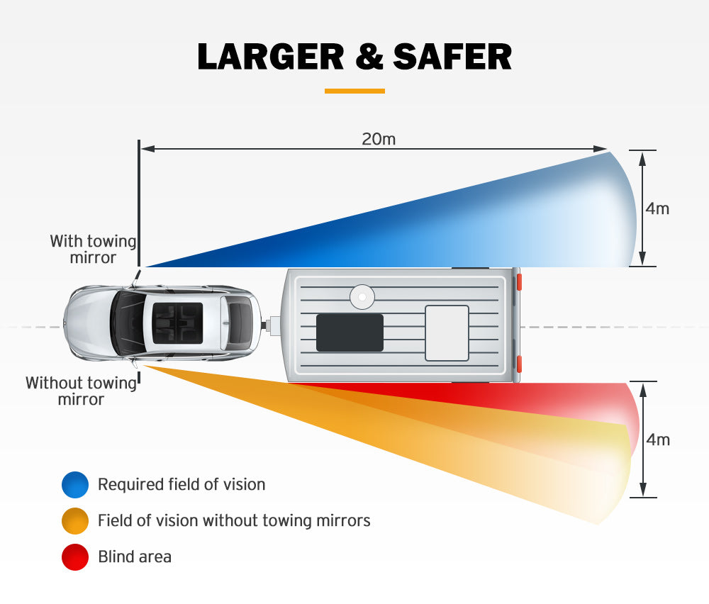 • Extended Reach: Our side mirrors slide out an additional 80mm and extend a total of 440mm from your car door, giving you maximum visibility.