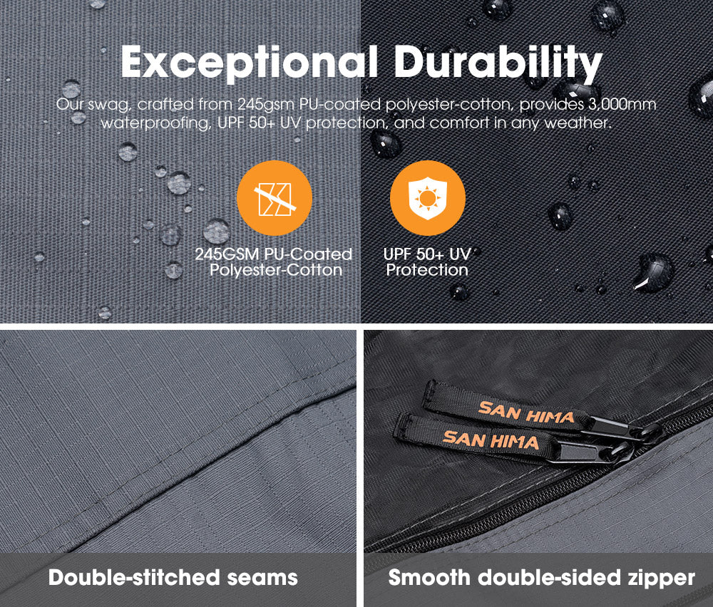 • Exceptional Durability: Our swag, crafted from 245gsm PU-coated polyester-cotton, provides 3,000mm waterproofing, UPF 50+ UV protection, and comfort in any weather.