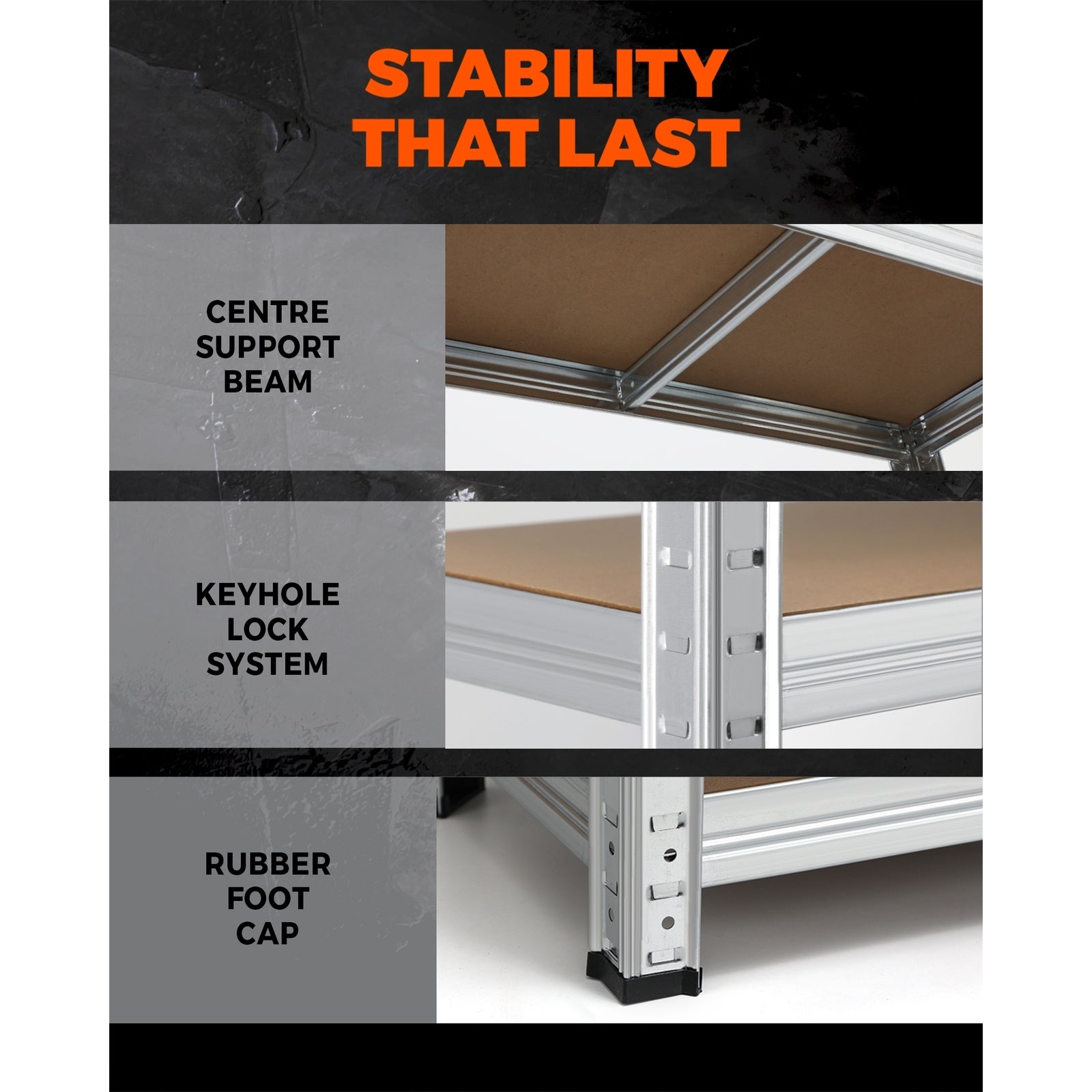 Store them safe and strong with our Sharptoo 5-tier Storage Shelf. With a stronger, corrosion-resistant cold rolled steel construction, the storage shelf structure will not easily buckle under heavy weight and each tier can hold up to 150kg in capacity. The sizeable 5mm thick MDF shelving allows for ample space to store anything with adjustable heights to make things more convenient for you. Plus, a centre support beam provides reinforced strength for every shelf. Best of all, putting together this storage shelf is fast and effortless with its boltless assembly that only requires a small assistance of a hammer or rubber mallet to set the catches in place. Use it in the garage, shed, home or shop, the Sharptoo 5-tier Storage Shelf can also be transformed into a work bench if desired. Need to say more?Set yours up today. WARNING: Children have died from furniture tipping over. Always secure furniture to prevent serious injury or death. Never allow children to climb or stand on furniture.