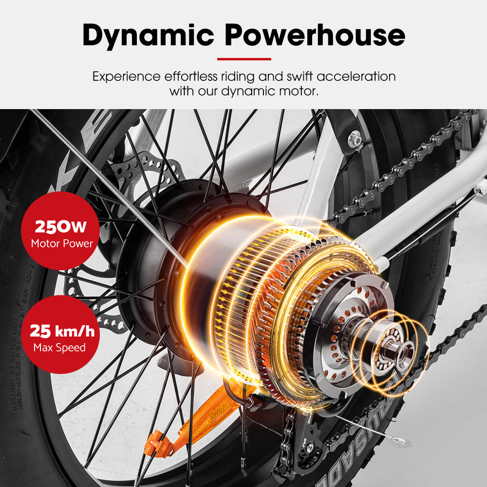 • Peak Performance: With quiet 250W brushless motor, our e-bike achieves speeds up to 25km/h in less than 5 seconds, ensuring effortless riding and swift acceleration.