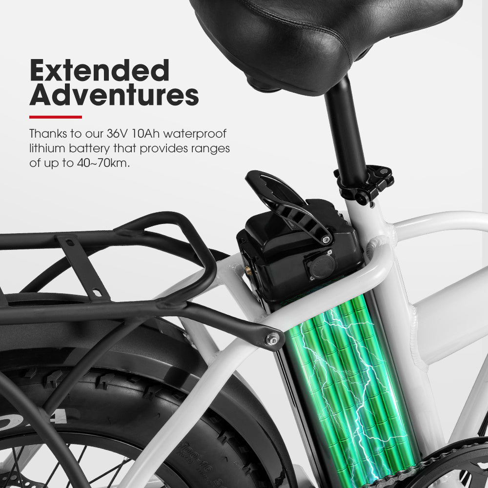 • Extended Adventures: Embark on longer journeys with confidence, thanks to our 36V 10Ah waterproof lithium battery, offering ranges of up to 70km.