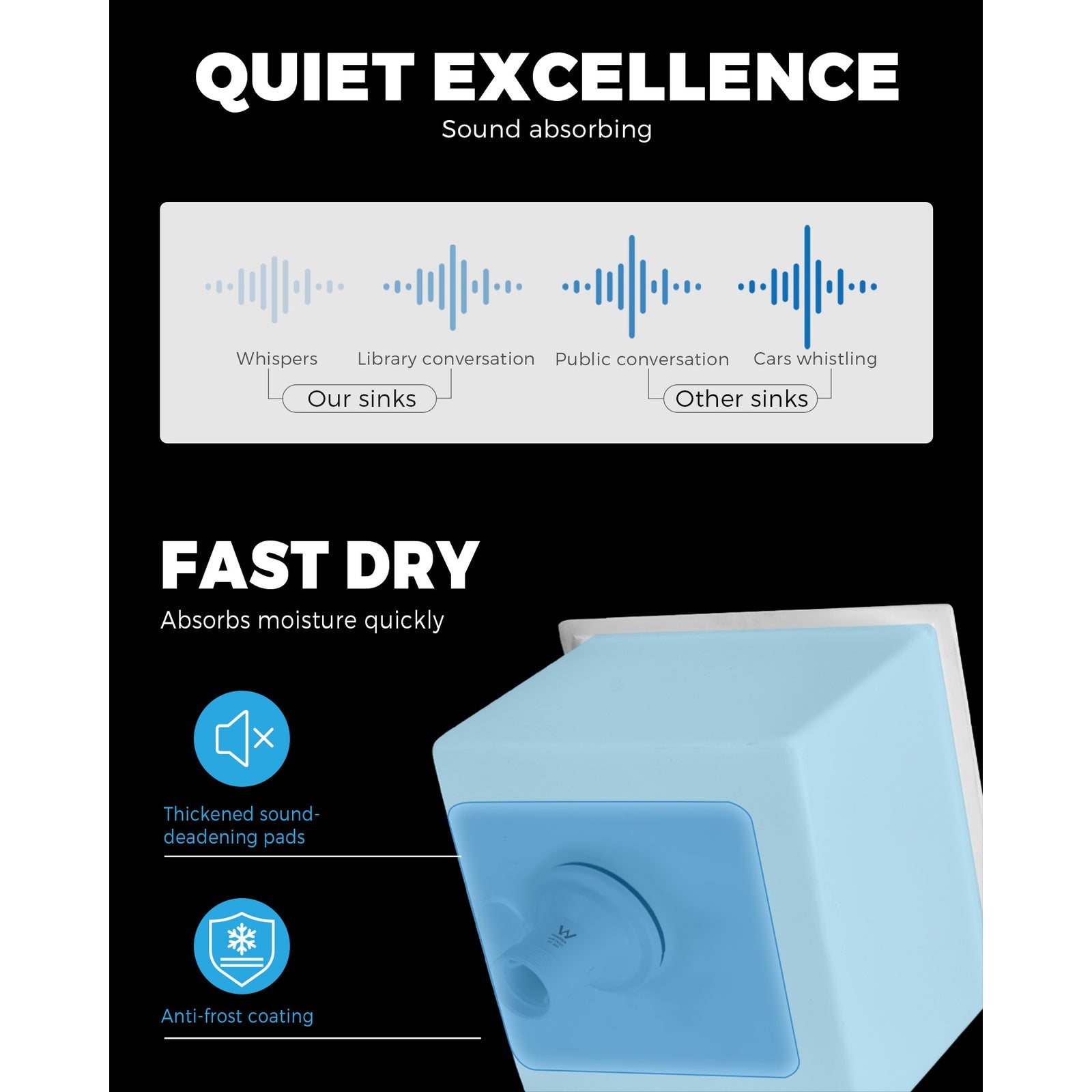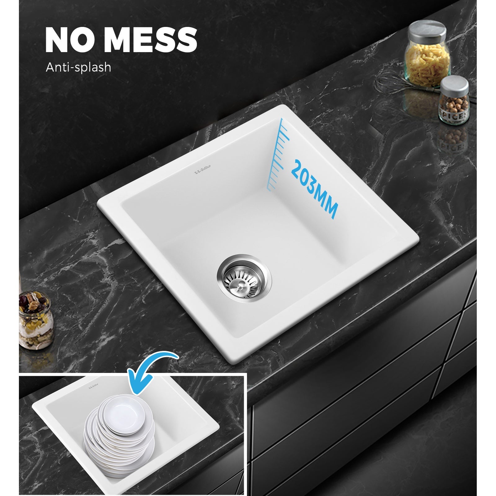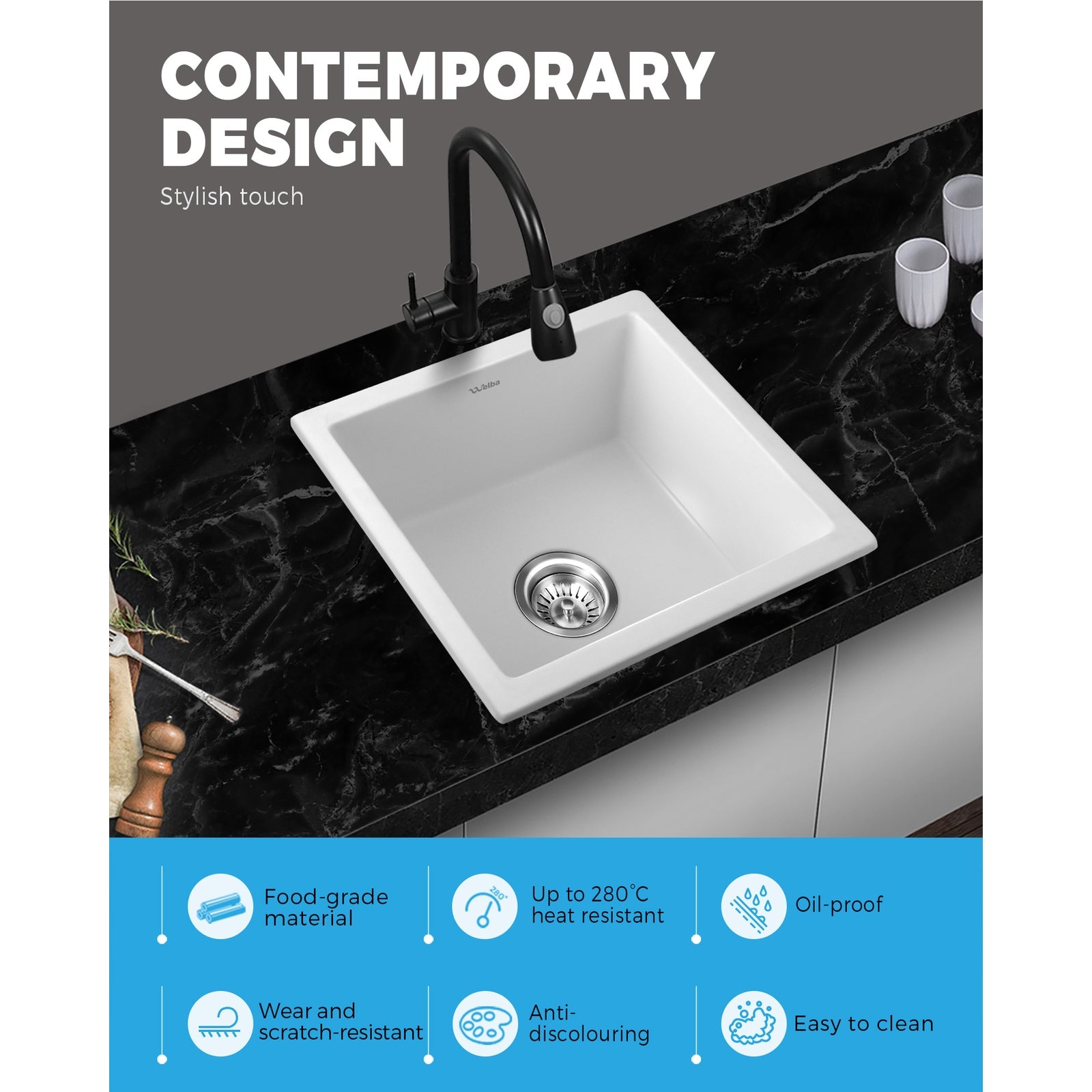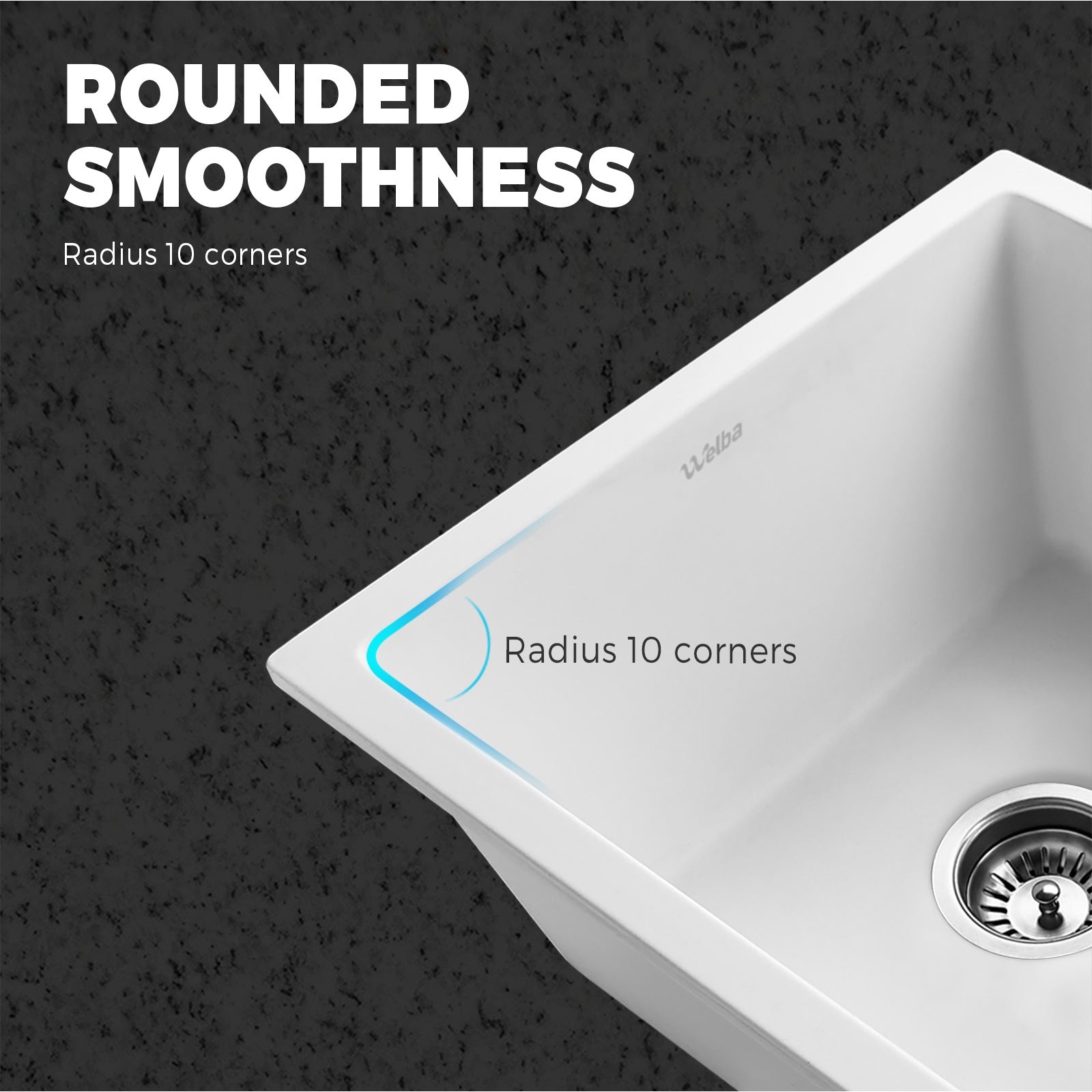 Looking for a sink that matches your expectations in every way. Then look no further than the Welba Granite Sink.Constructed of a granite composition of 80% granite and 20% natural resin in a smooth burnt wood finish, the sink is simply rock solid. With totally desirables attributes such as enhanced wear, scratch and corrosion resistance, oil-proof, anti-bacterial, anti-discolouring and food-grade safe. Plus, the material also makes the sink easy to clean with a beautiful lotus leaf effect presenting itself after the cleaning. Better still, the deep bowl design and R10 corners provide plenty of space to do your dishes or prepare your cooking ingredients with minimum fuss. In fact, the sink comes with built-in thickened sound-deadening pads for better sound absorption that equals to whispers and library conversational levels. Not least, the Watermark-certified 304 stainless steel waste strainer, included as standard equipment, ensures that nothing gets clogged up with the plumbing.